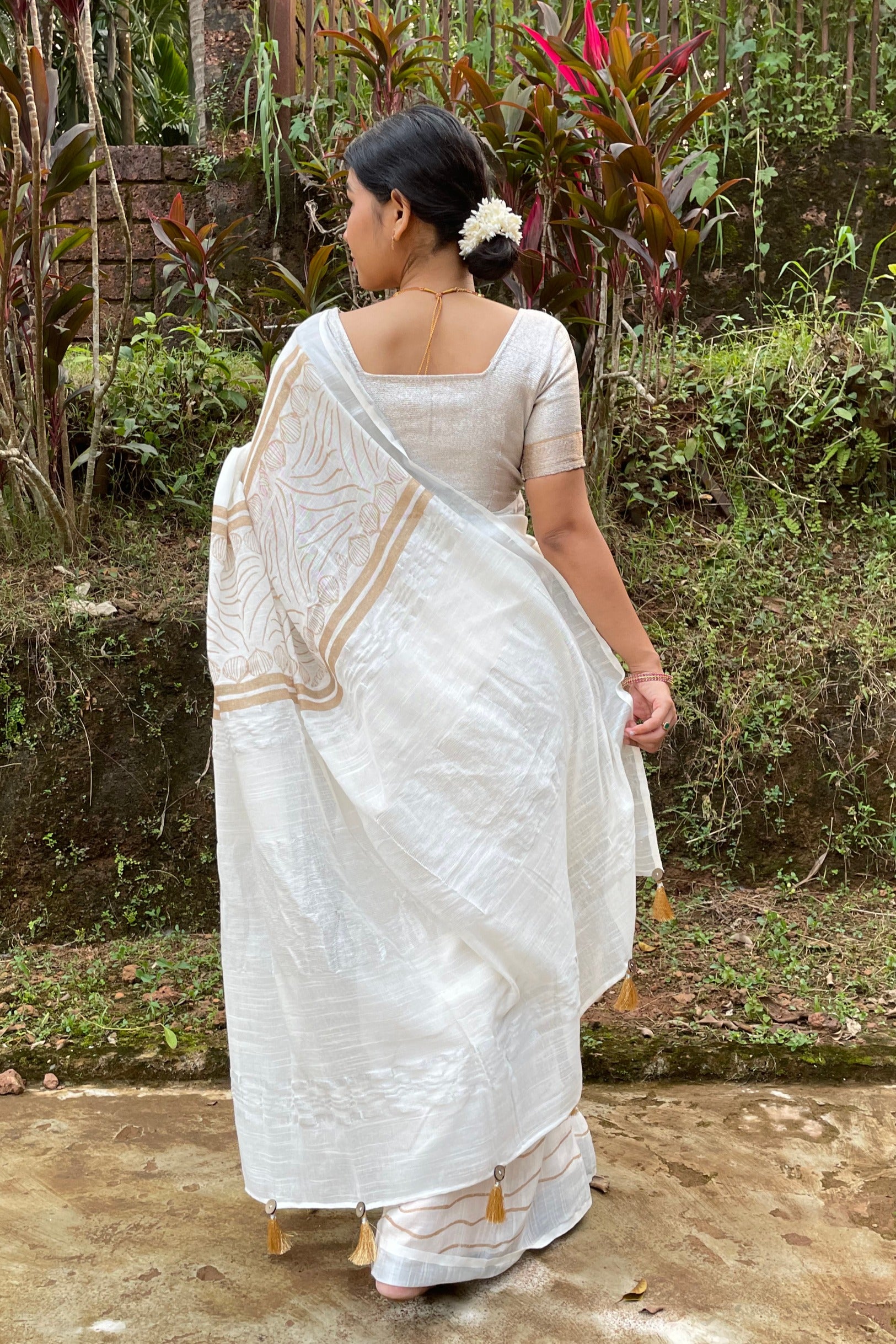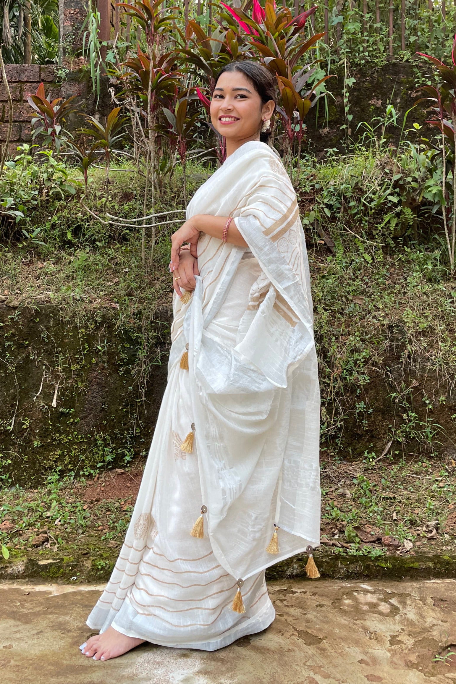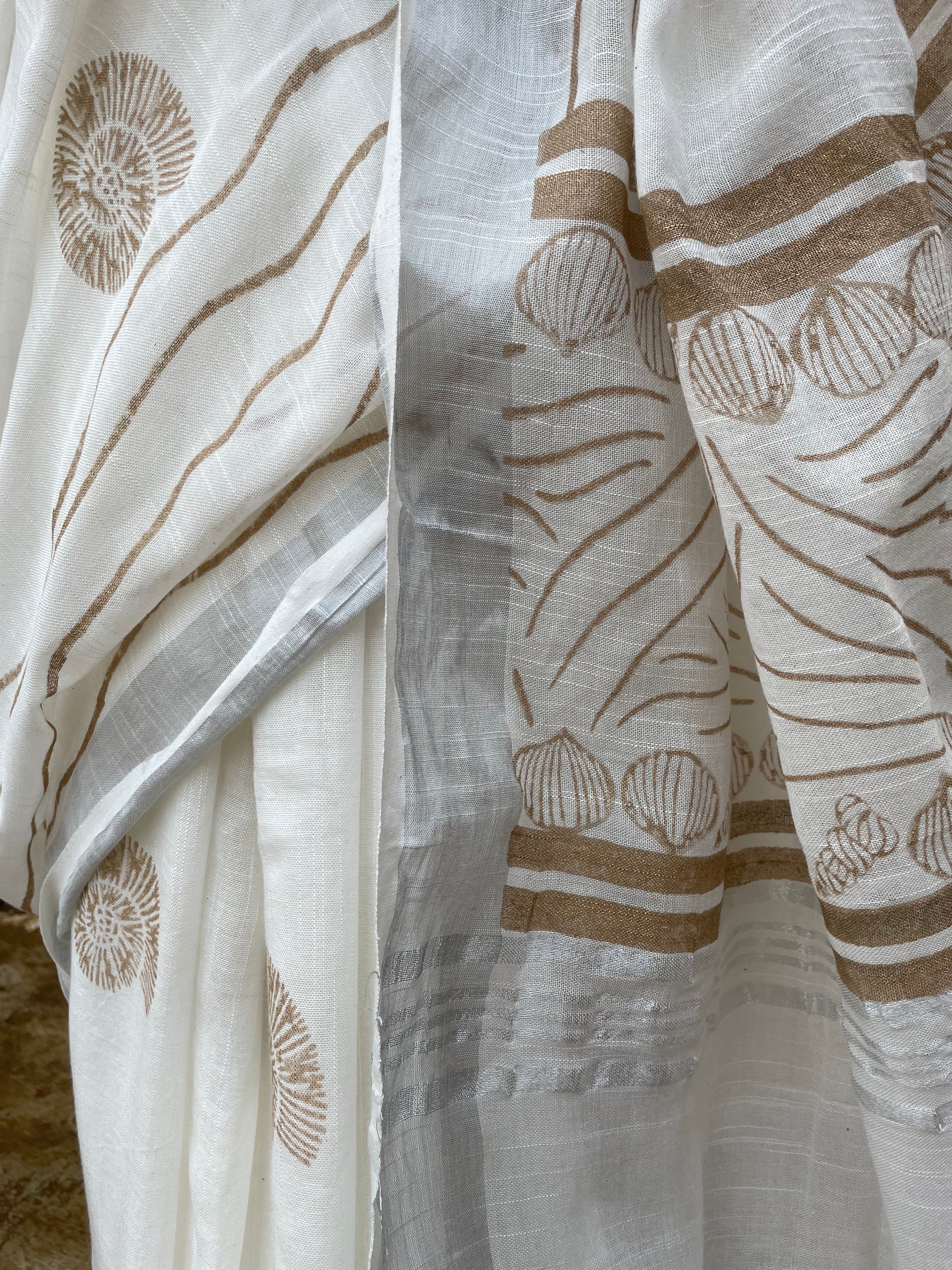 Merel Conchas Linen saree is always a delight to drape. The subtle weight holds down the fabric well. The print on this white Conchas saree is so intricate, I also have the identical black conchas, I love them both. They can either be dressed down or up, depending on the setting of the occasion. It truly a special saree to own