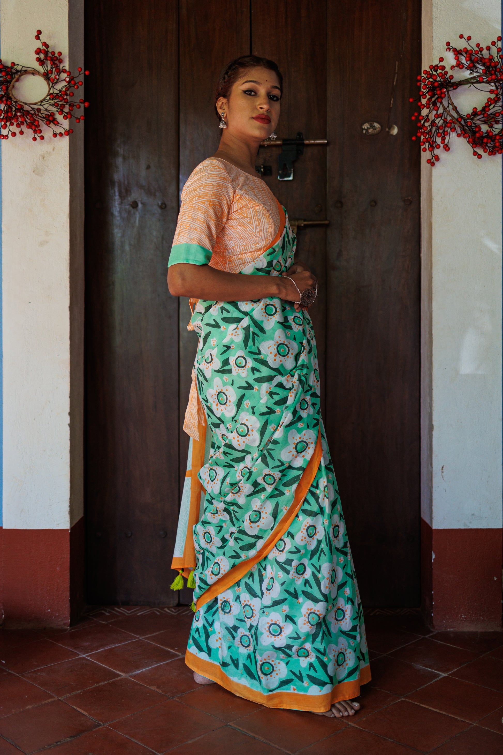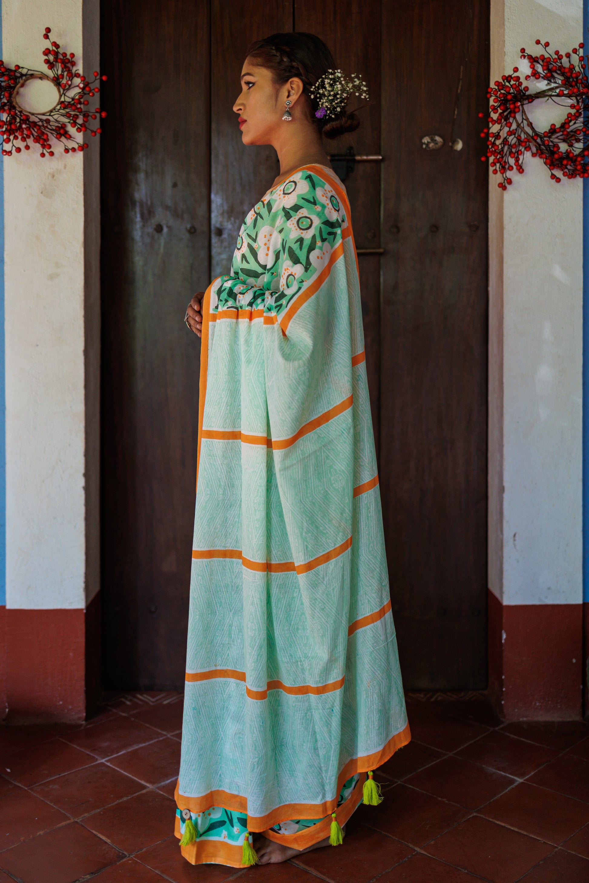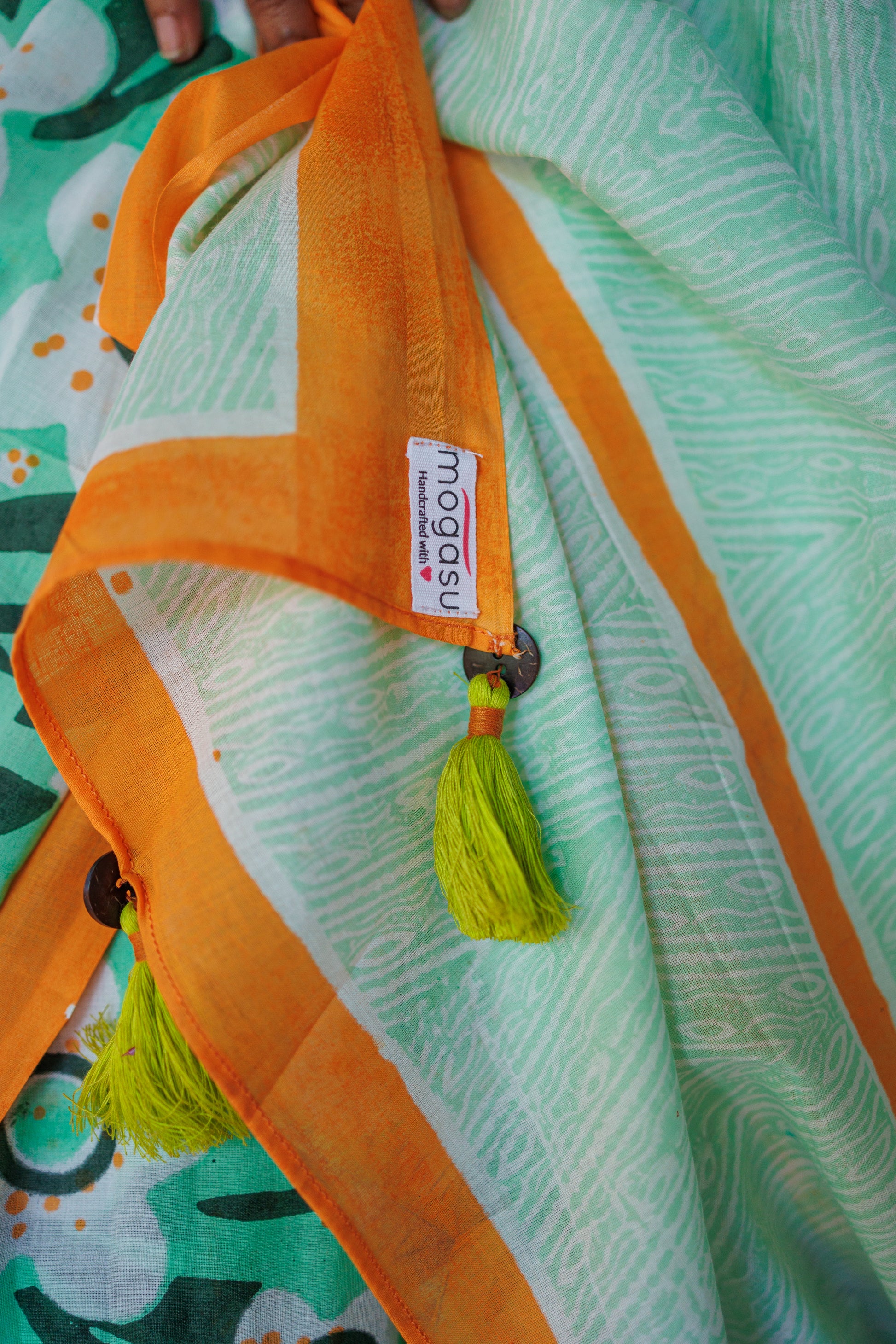 Do you remember the shape of the first flower you drew as a child? Gul - meaning flower in Hindi, is a cute Mogasu saree that is inspired by these nostalgic round flowers amidst the bright coloured houses. The pattern is made of dark and light green leaves, with a white flower & orange pollen dots. The saree is available in Mul cotton and is the cutest print we have ever created!