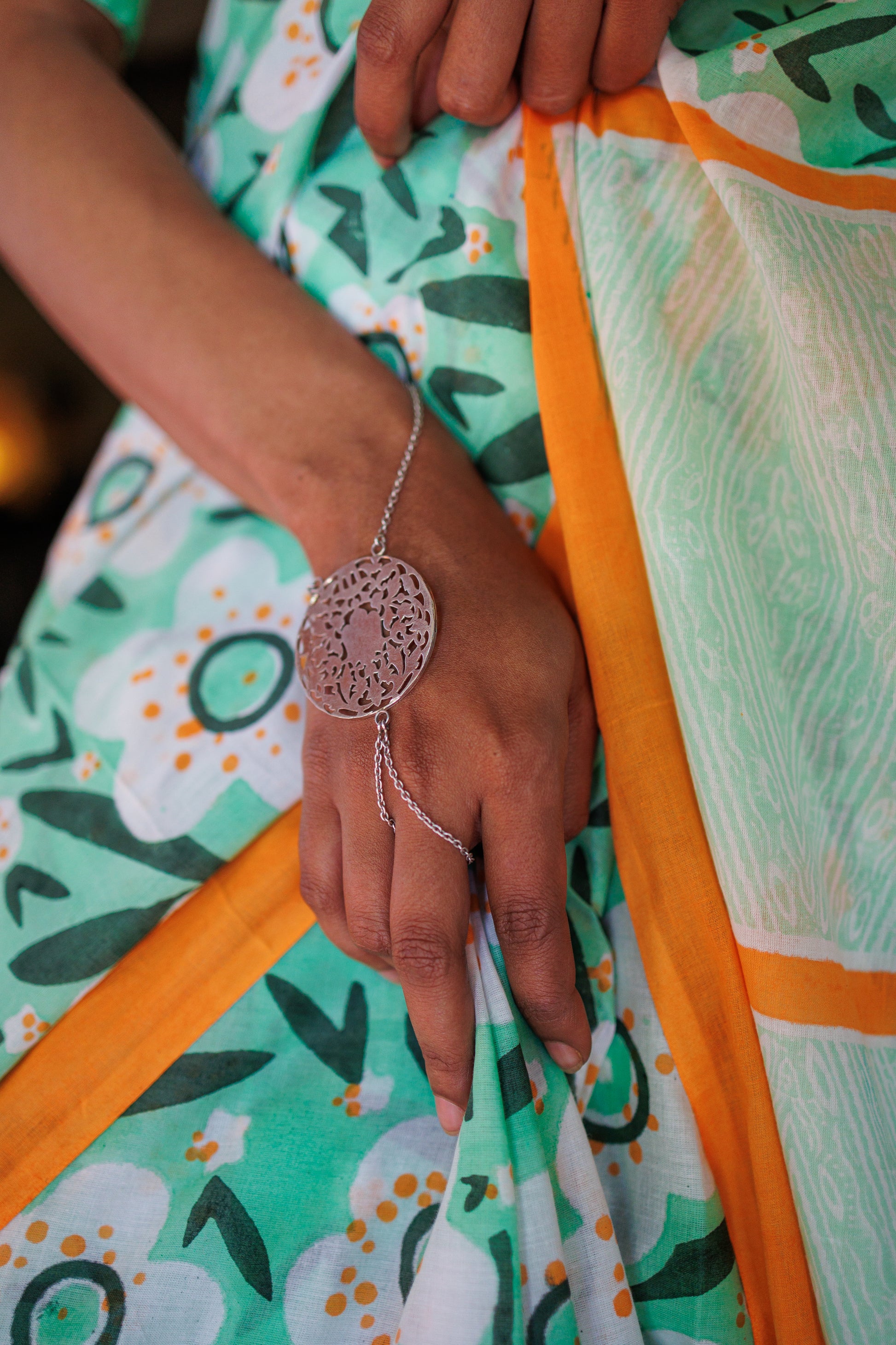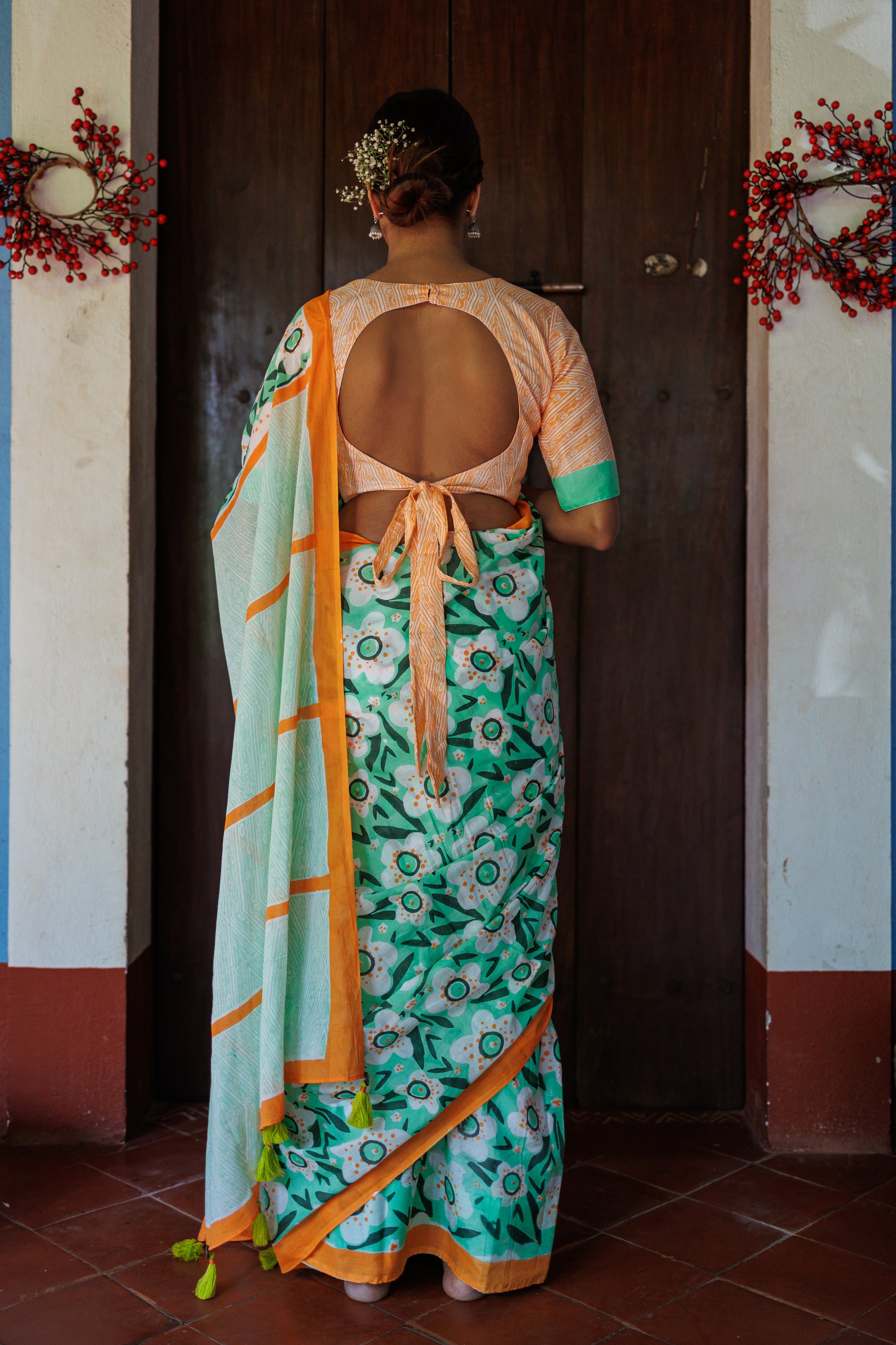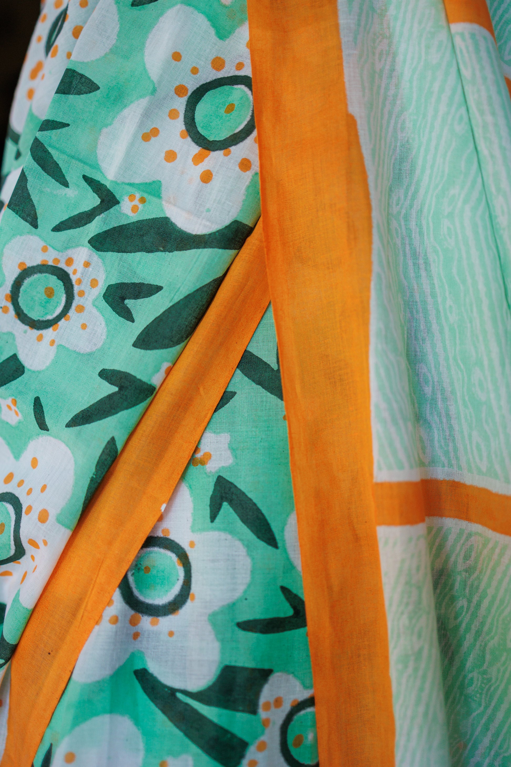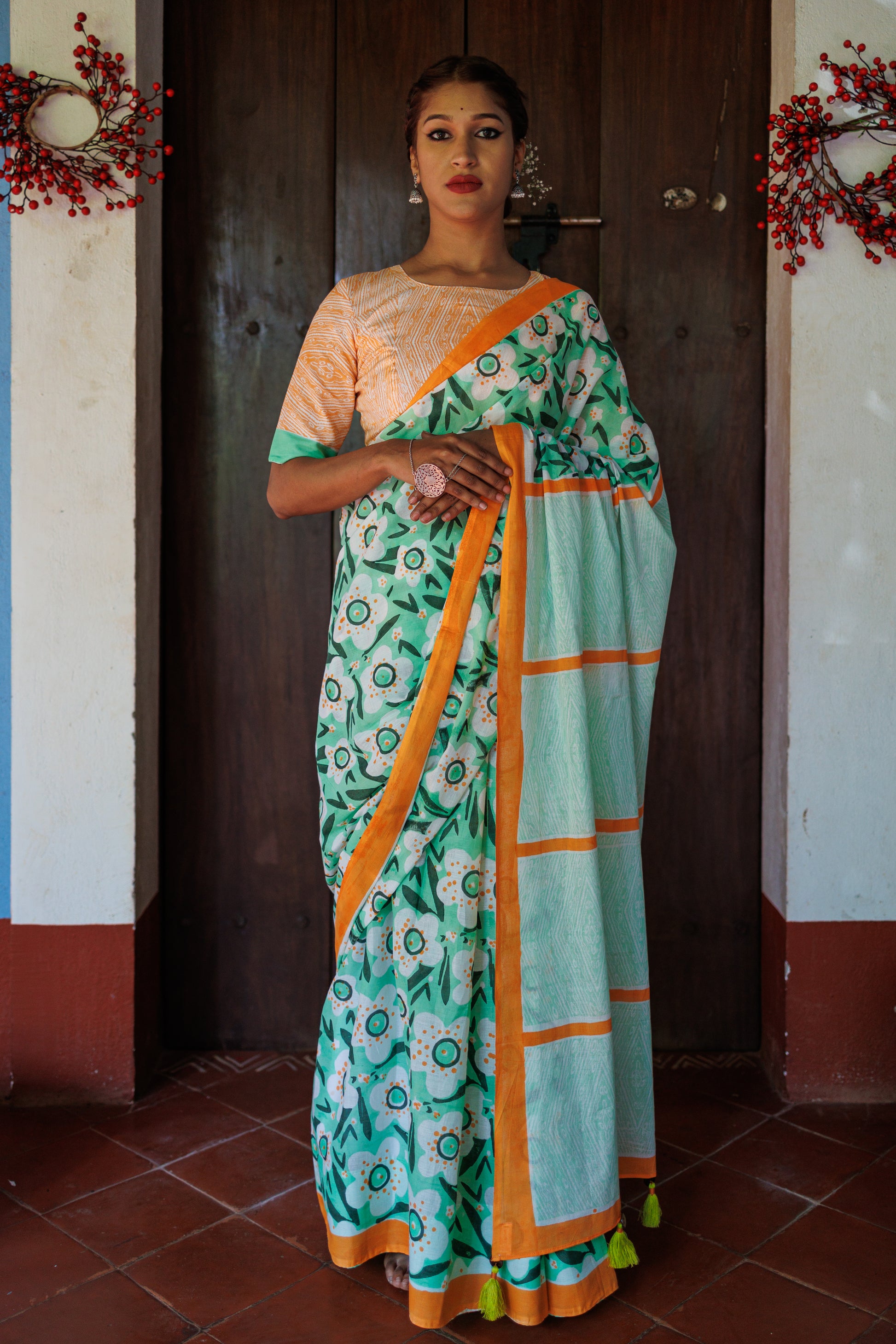 Do you remember the shape of the first flower you drew as a child? Gul - meaning flower in Hindi, is a cute Mogasu saree that is inspired by these nostalgic round flowers amidst the bright coloured houses. The pattern is made of dark and light green leaves, with a white flower & orange pollen dots. The saree is available in Mul cotton and is the cutest print we have ever created!