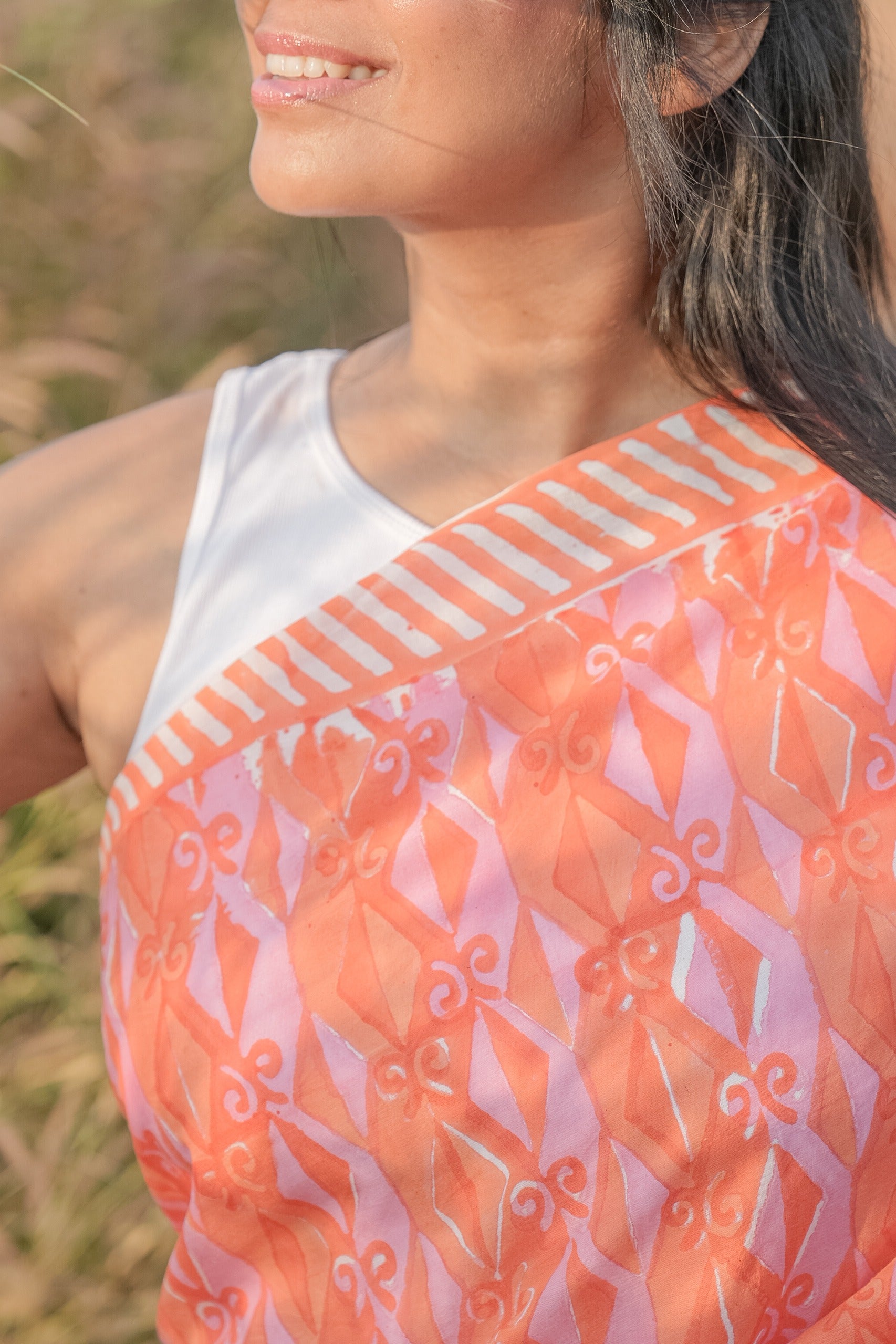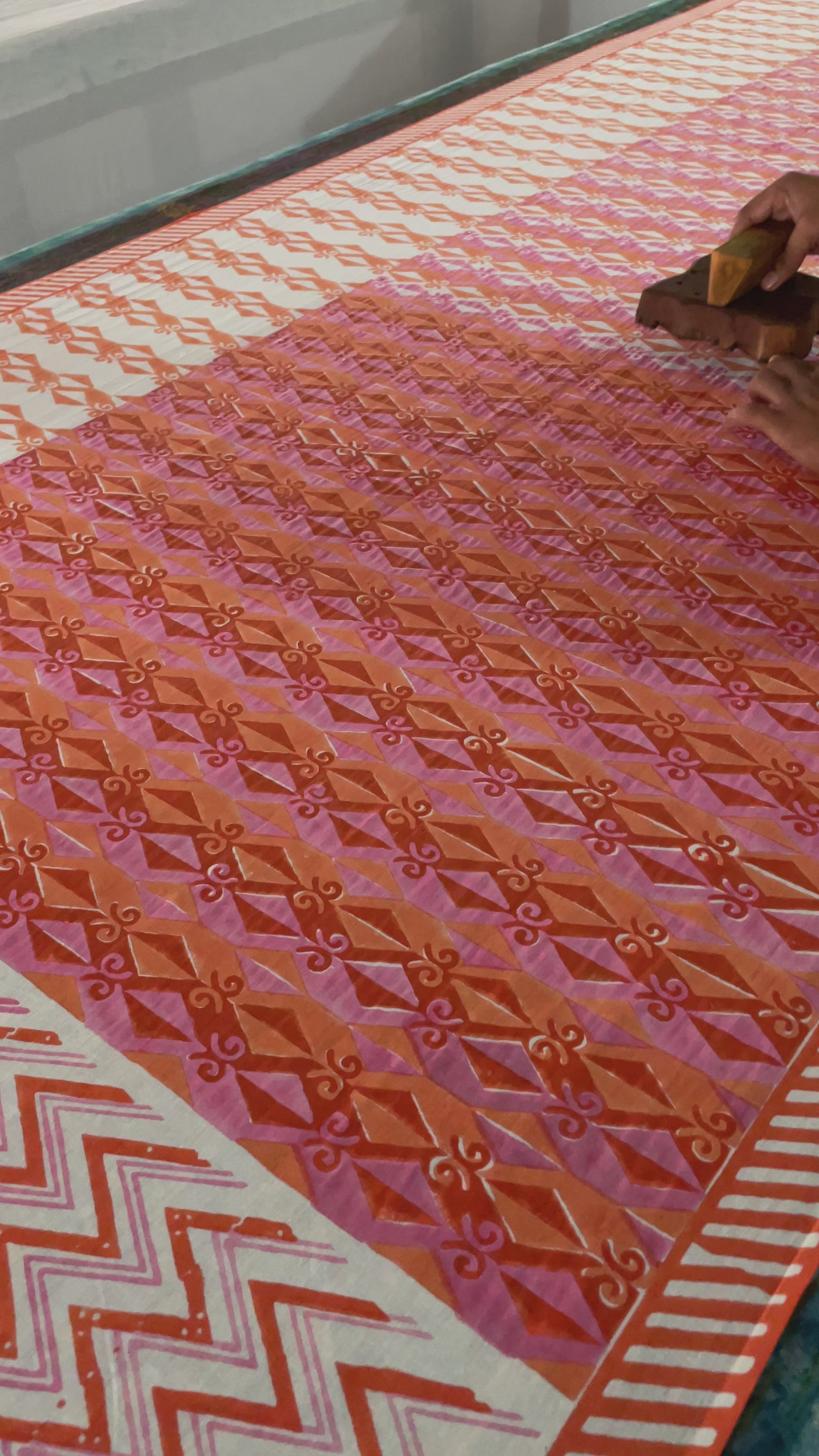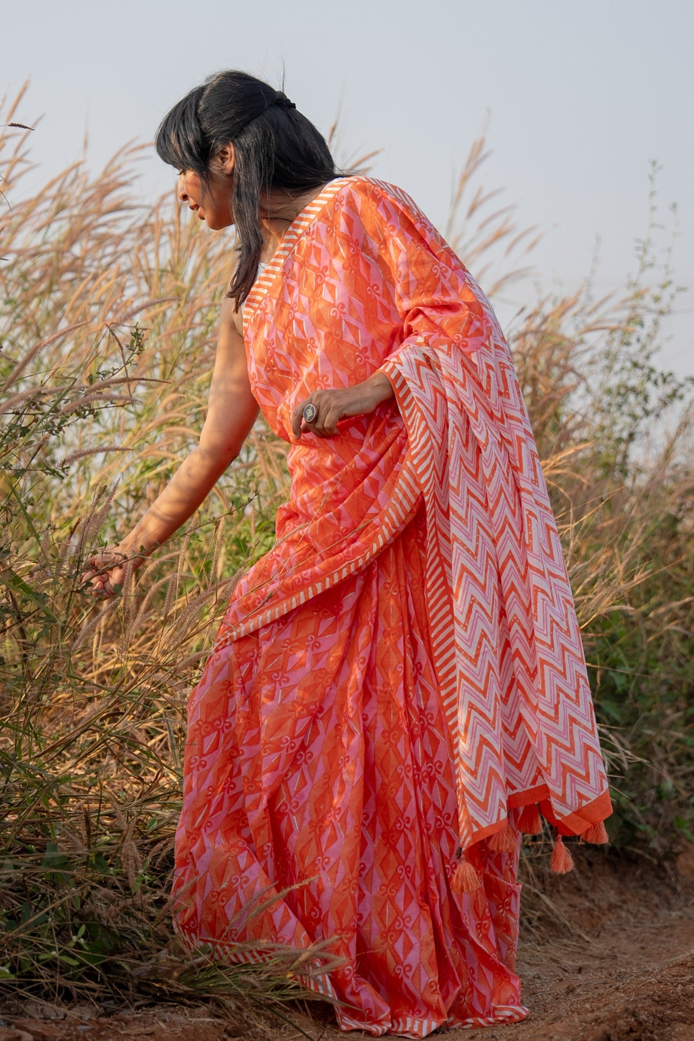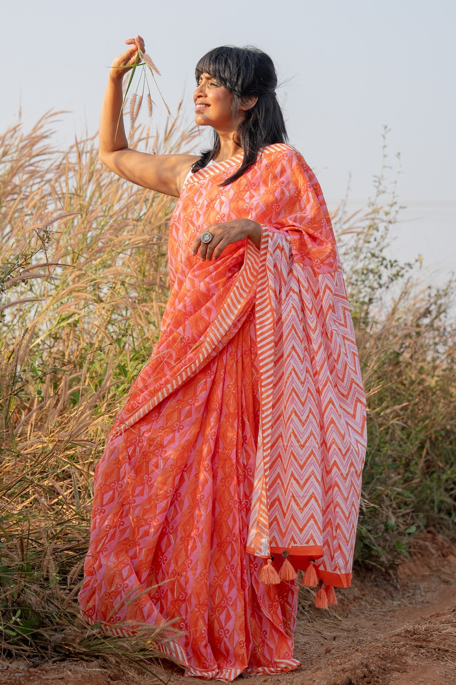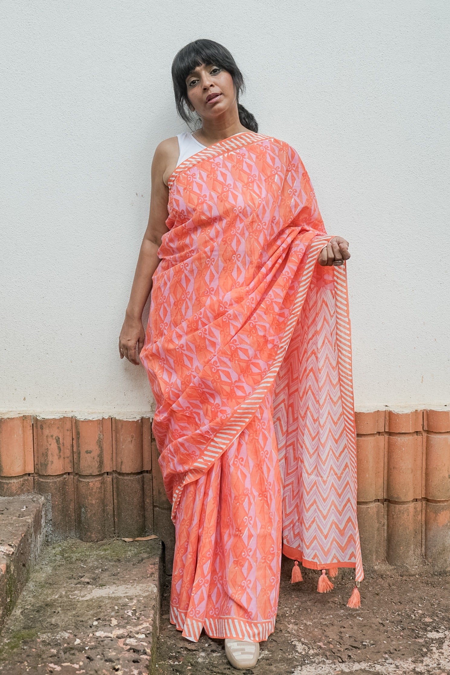 Remember our stunning Khidki saree from our debut collection? It captured your hearts so much that we simply had to bring you a sequel! Introducing Khidki saree version 2. Picture this: a delightful array of vibrant glasses, reminiscent of the charming windows adorning Goan homes. The intricate spirals within the design draw inspiration from the graceful curves of oyster shells, a nod to the traditional Goan window patterns. As for the pink and orange hues, they mirror the captivating colors of Goan houses. And let's talk about the pallu – a sight to behold, elegantly adorned with adorable contrasting tassels. Oh, and did we mention? We've also introduced a regal purple variant in this same exquisite design, check it out here. Our Janela saree comes in mul mul fabric and the saree pallu is finished with the cutest orange tassels. Saree comes with a blouse piece as shown in the last picture.