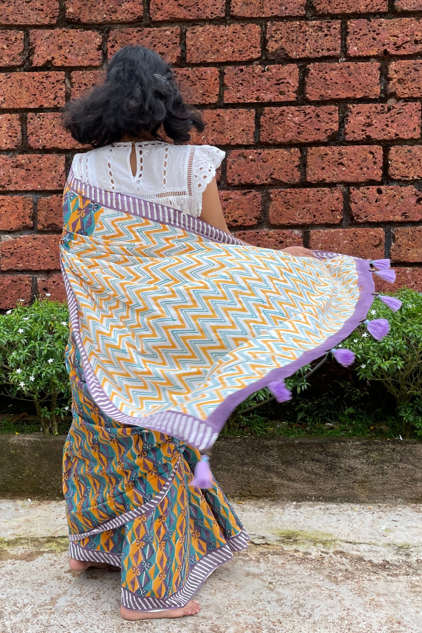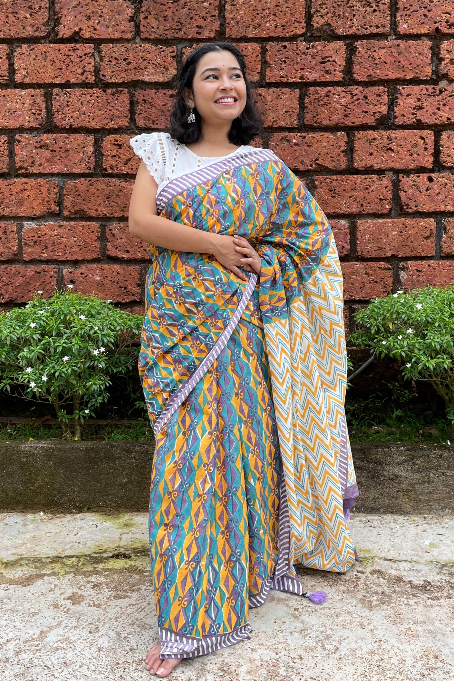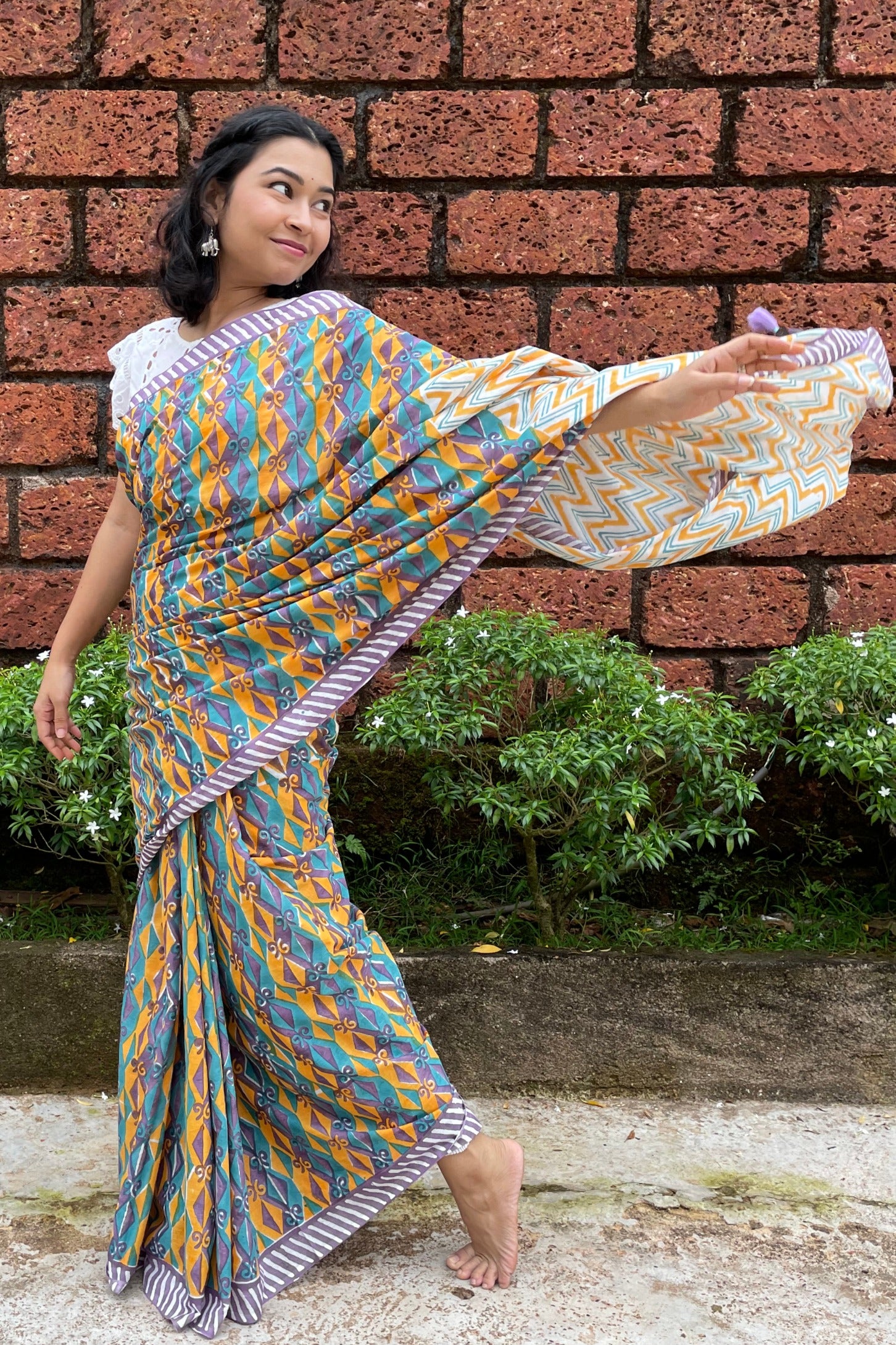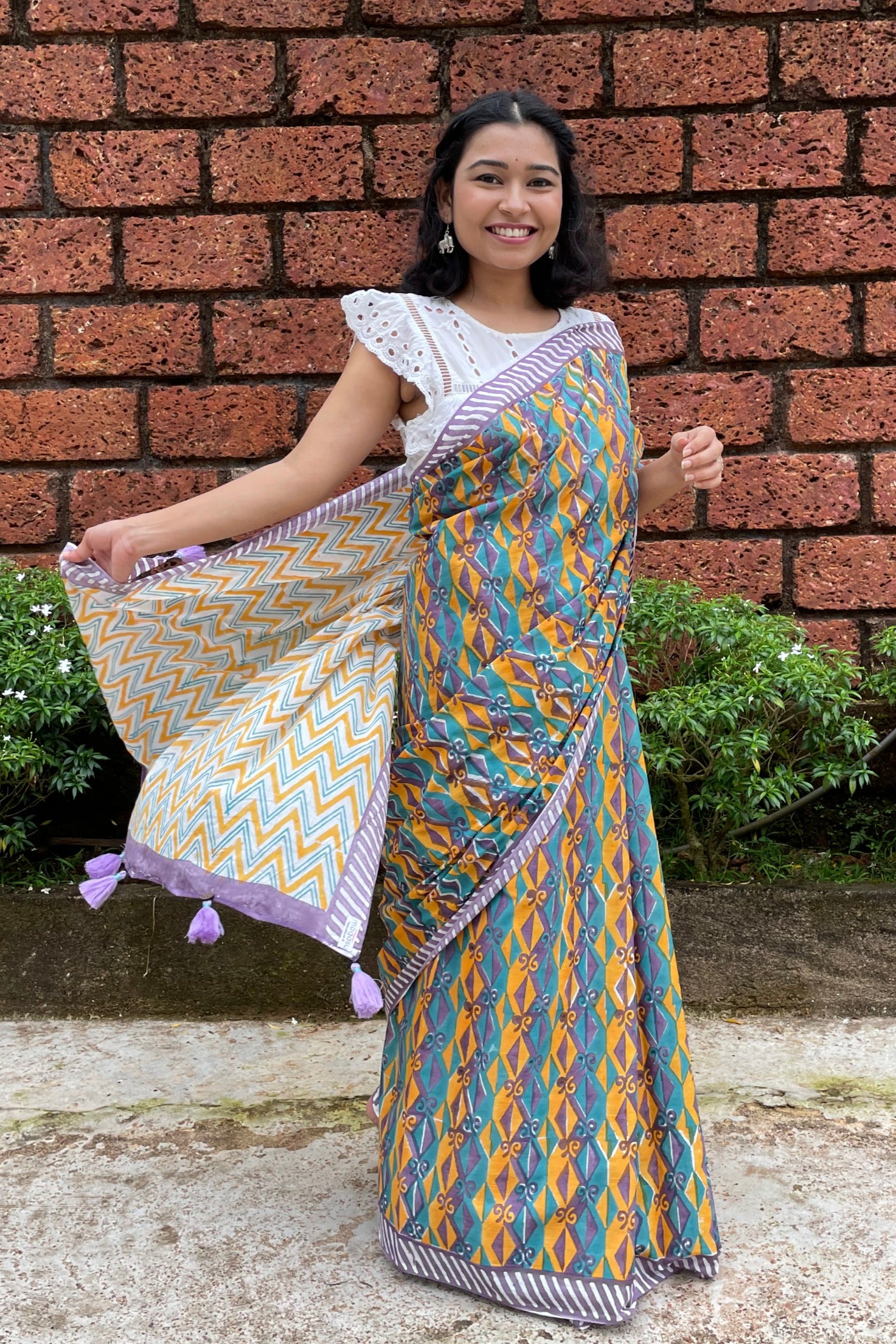 Remember our stunning Khidki saree from our debut collection? It captured your hearts so much that we simply had to bring you a sequel! Introducing Khidki saree version 2. Picture this: a delightful array of vibrant glasses, reminiscent of the charming windows adorning Goan homes. The intricate spirals within the design draw inspiration from the graceful curves of oyster shells, a nod to the traditional Goan window patterns. As for the purple and blue hues, they mirror the captivating colors of Goan houses. And let's talk about the pallu – a sight to behold, elegantly adorned with adorable contrasting tassels. Oh, and did we mention? We've also introduced a regal orange variant in this same exquisite design, check it out here. Our Janela saree comes in mul mul fabric and the saree pallu is finished with the cutest purple tassels. Saree comes with a blouse piece as shown in the last picture.
