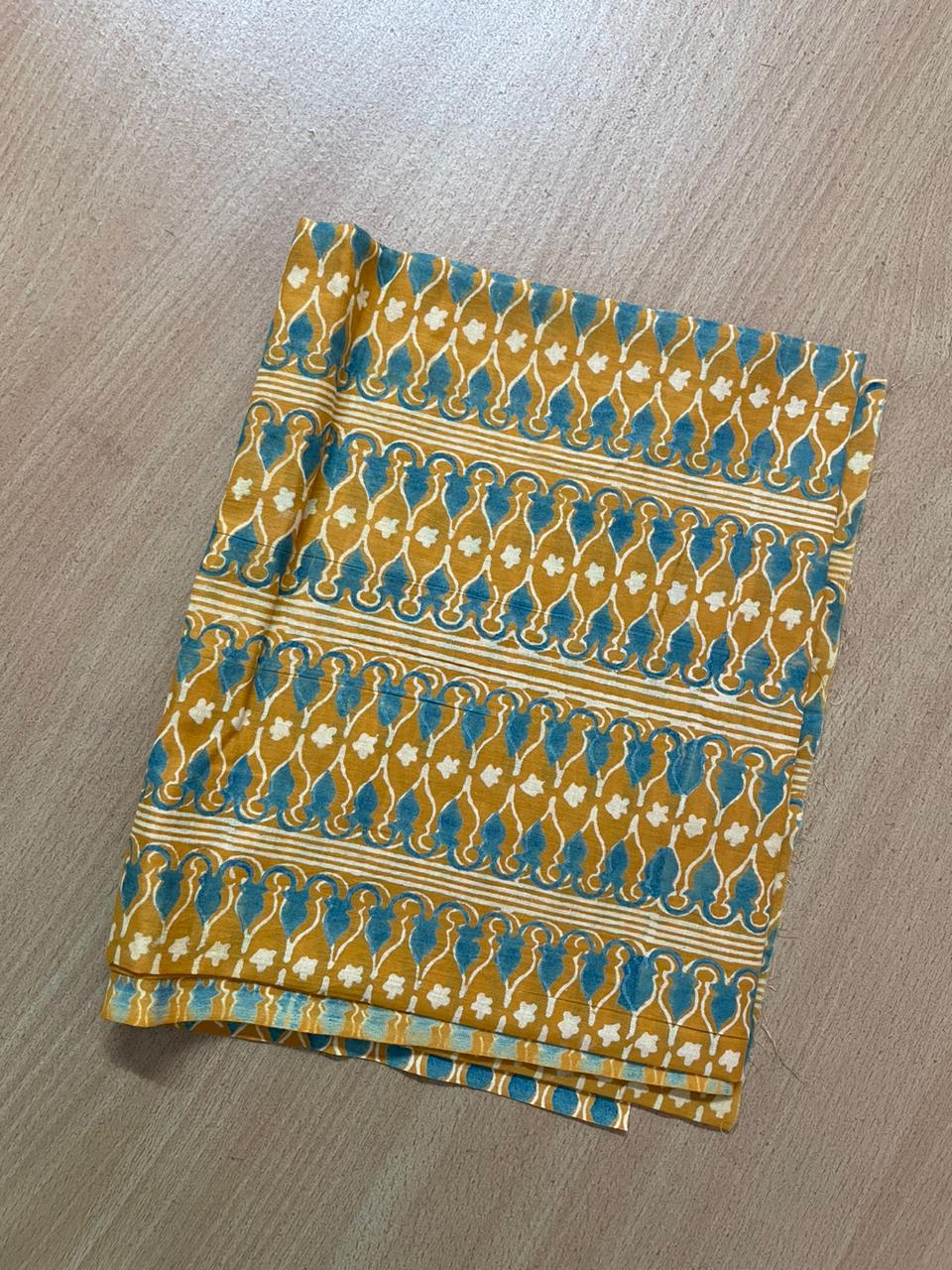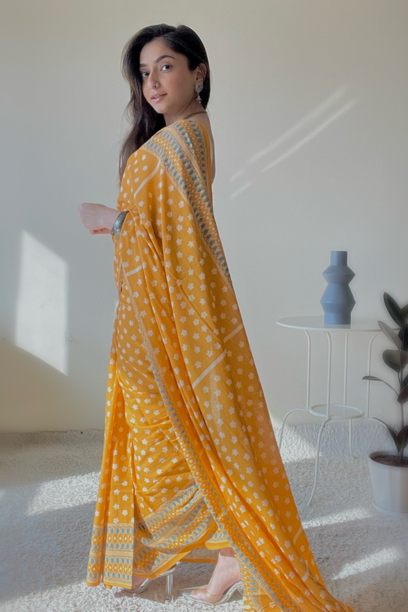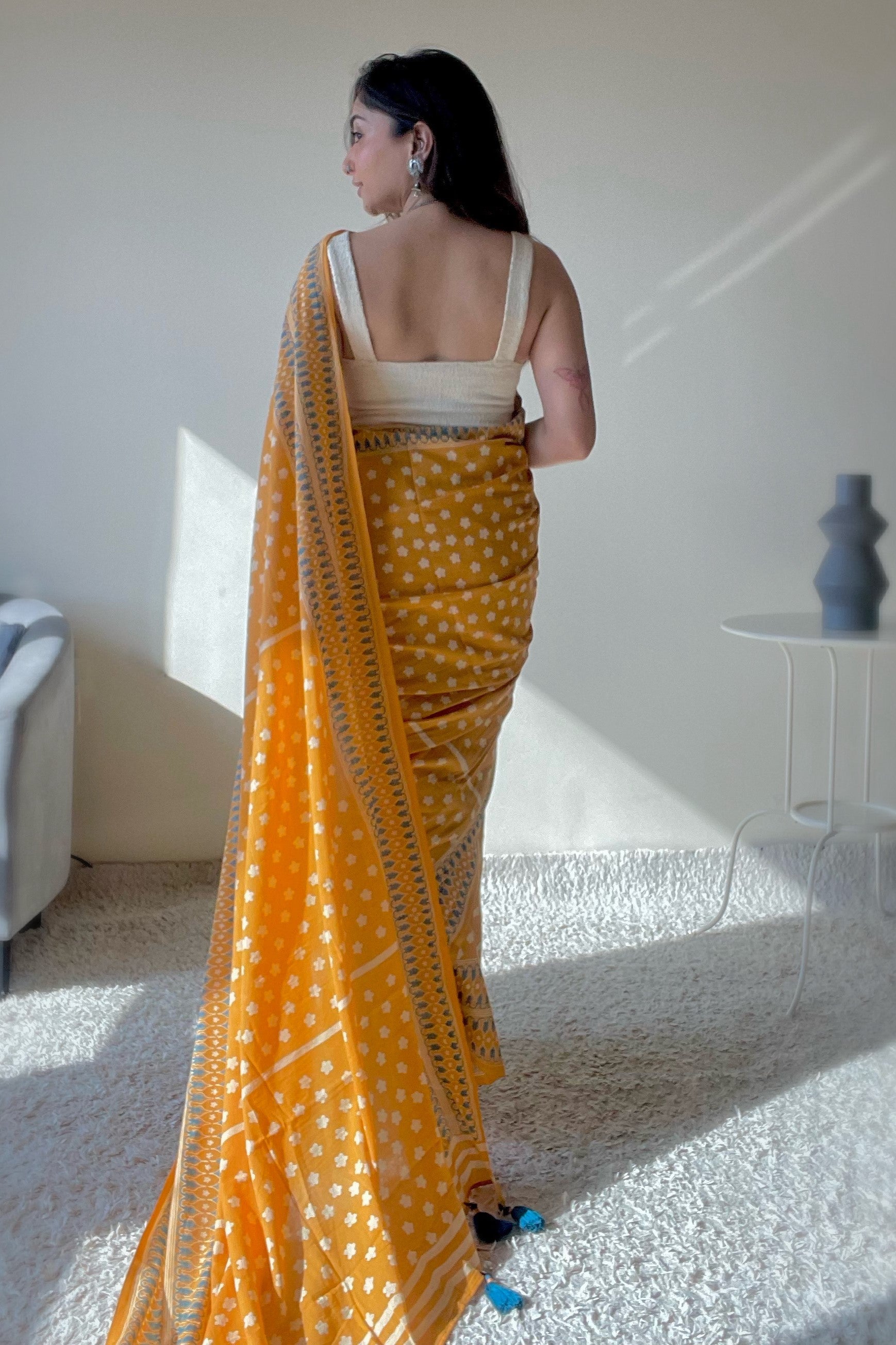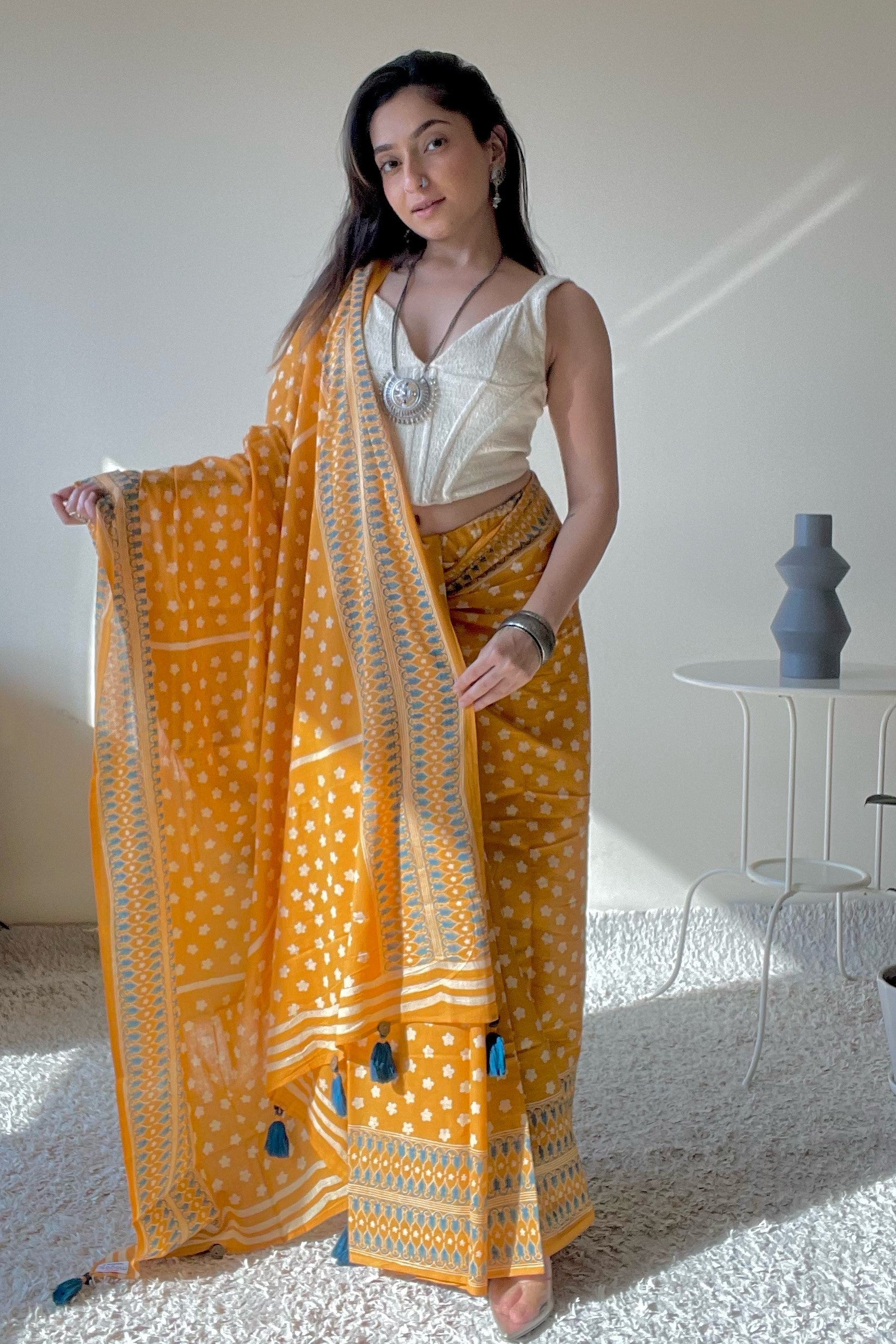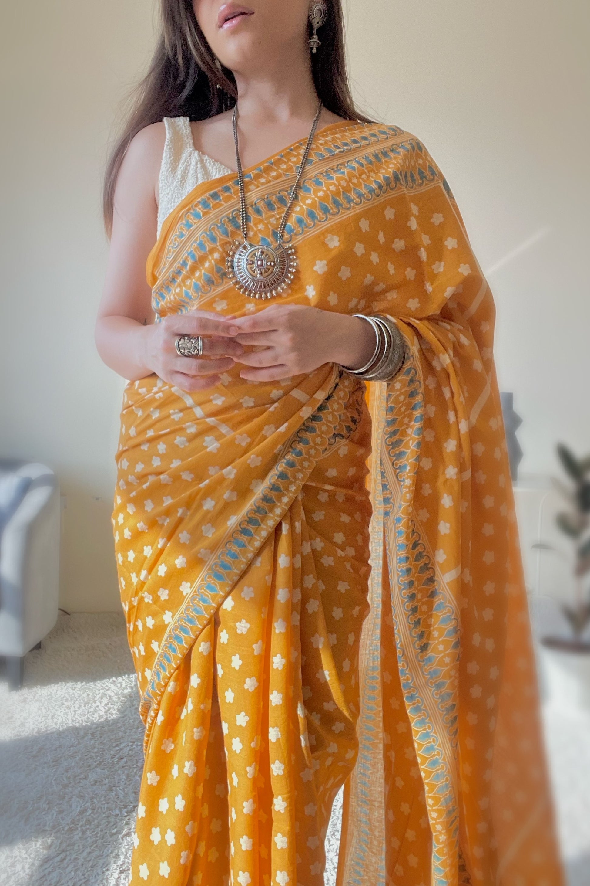 A fresh golden-yellow color is here to brighten your day! Our Kala saree features the most commonly found motif in Kaavi art, the tear-drop-shaped border. The saree is adorned with small floral designs, adding the perfect touch of cuteness to our sunshine saree. Don't miss out on this delightful piece! Saree comes in the softest mul cotton fabric and is adorned with cute contrasting tassels at pallu. Saree comes with the same blouse piece as shown in the last picture.