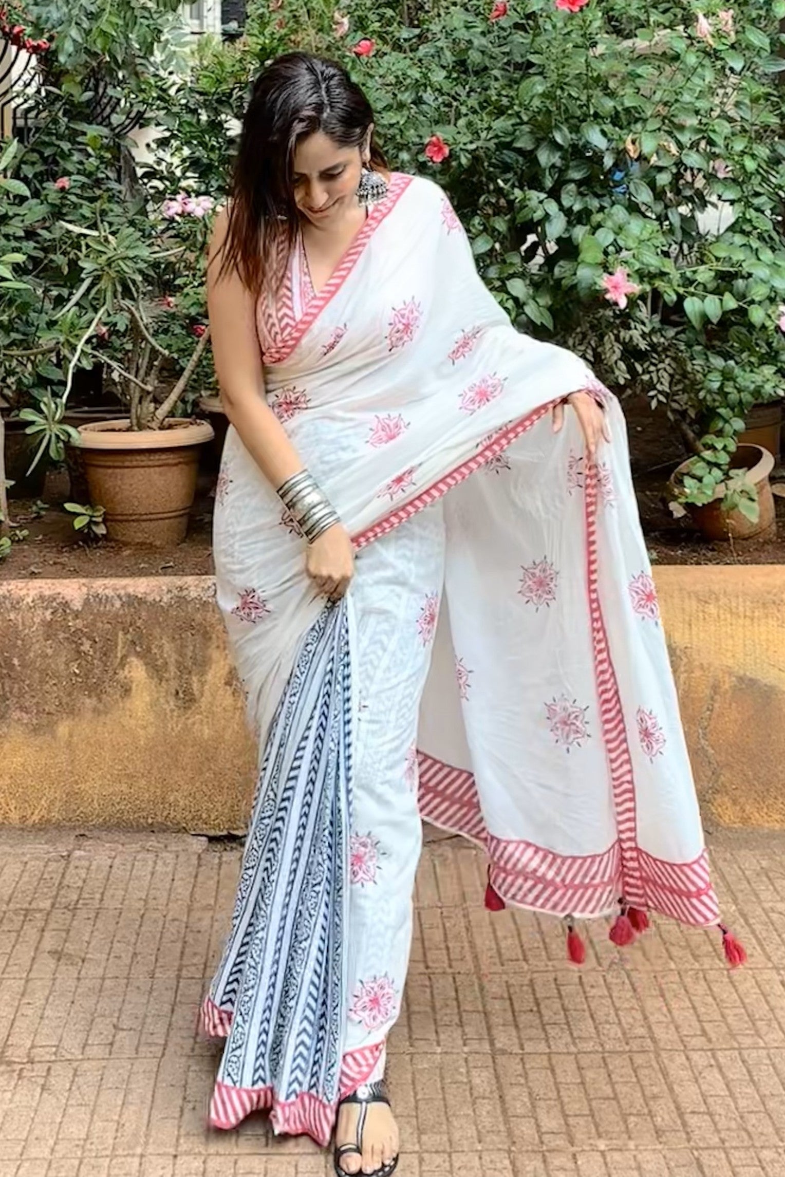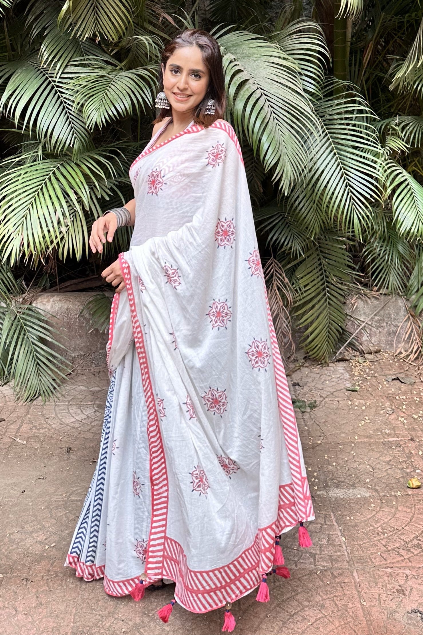 Each saree is approximately 5.5 m in length and 45 inches in width. All sarees come with an 80 cm unstitched blouse piece, edging & tassels.