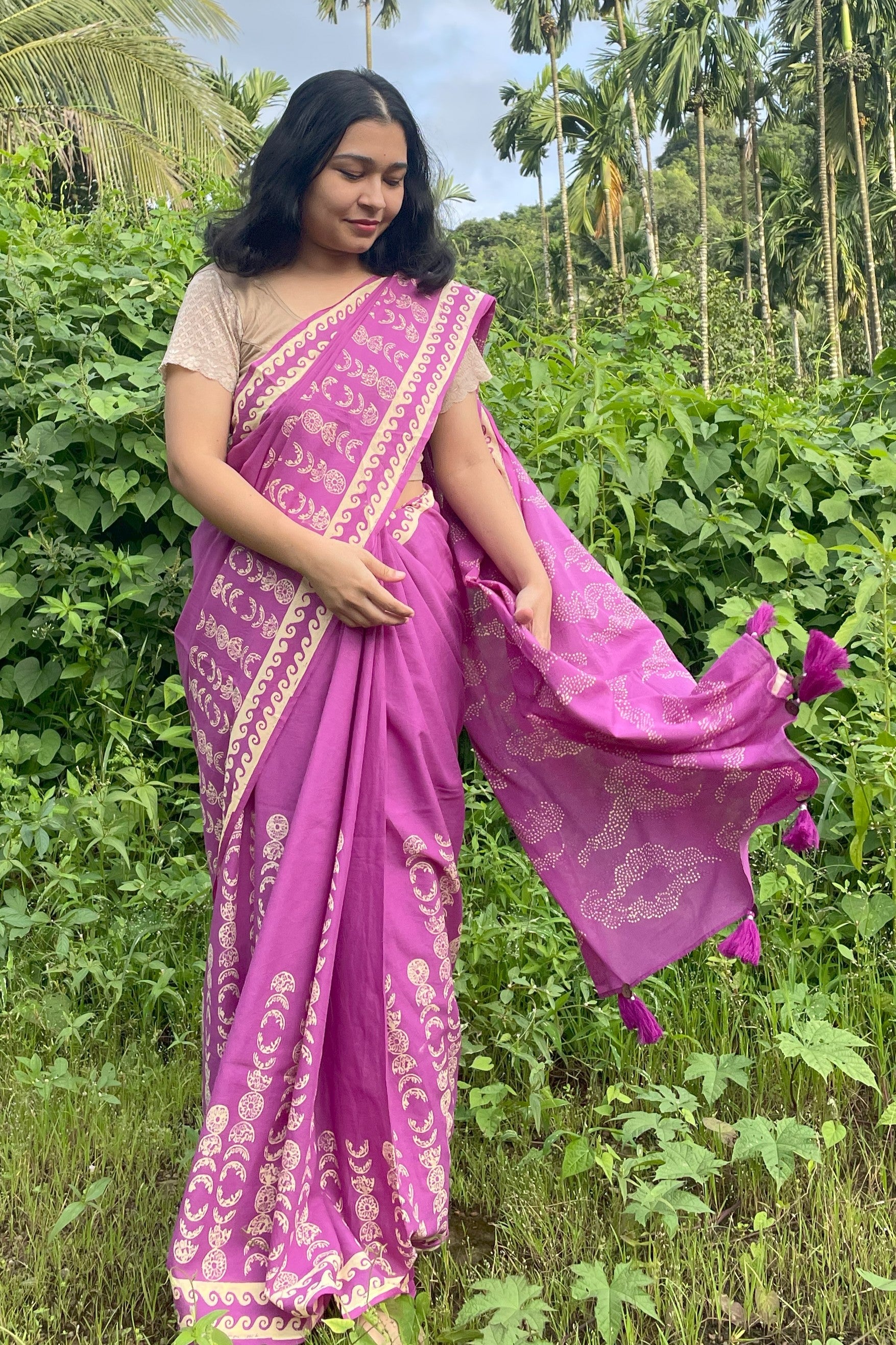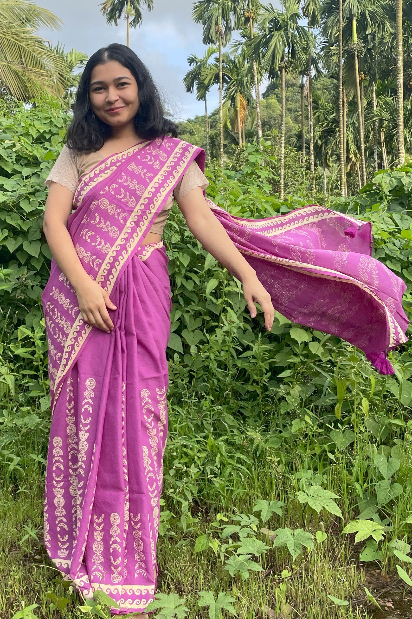 A magenta saree inspired by Goa’s pink monsoon skies. On rainy evenings, the clouds often hide the moon, so we reimagined it with floral moon phase motifs and a dreamy cloud-filled pallu. It’s soft, moody, and made for nights that feel a little bit magical.