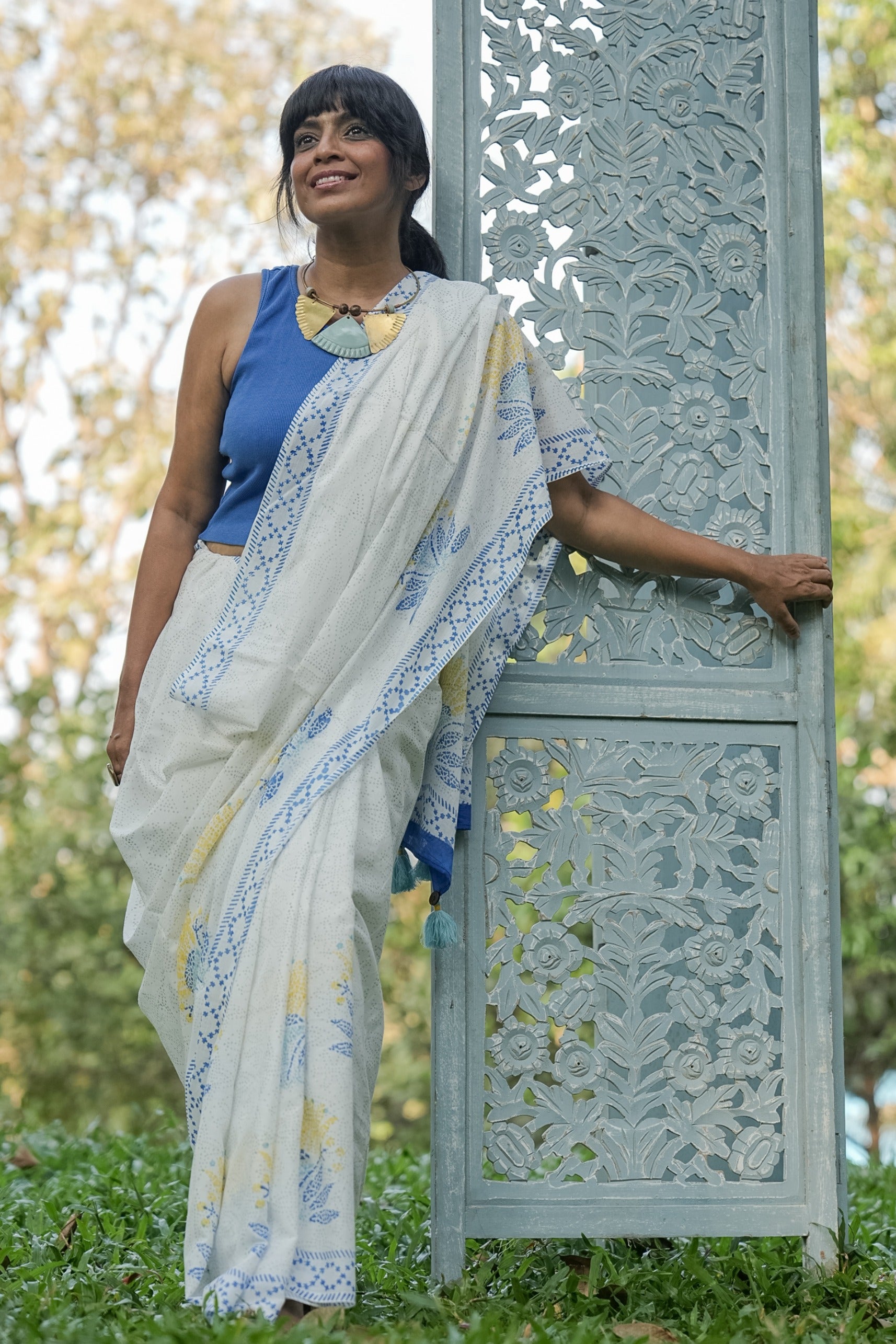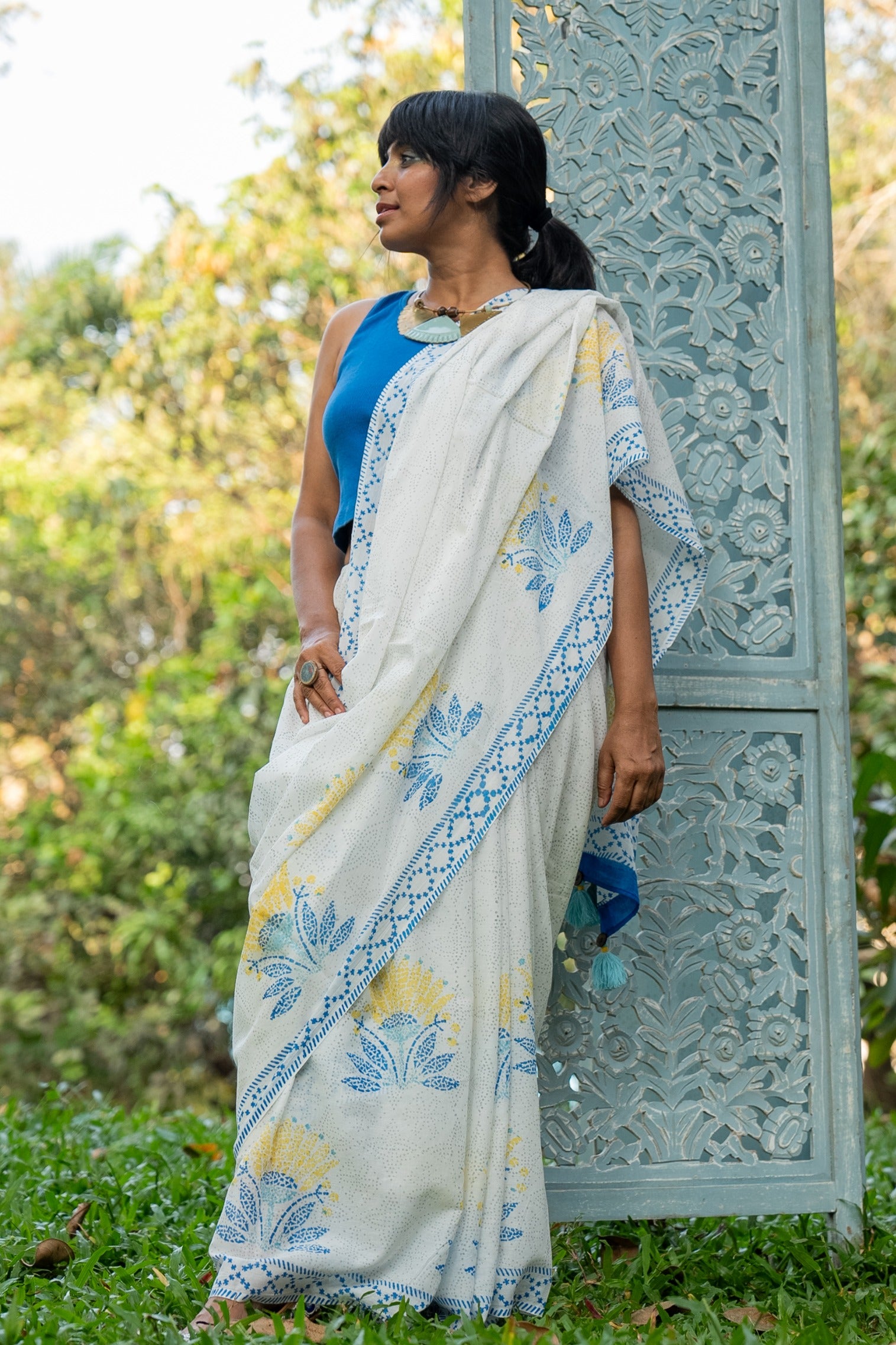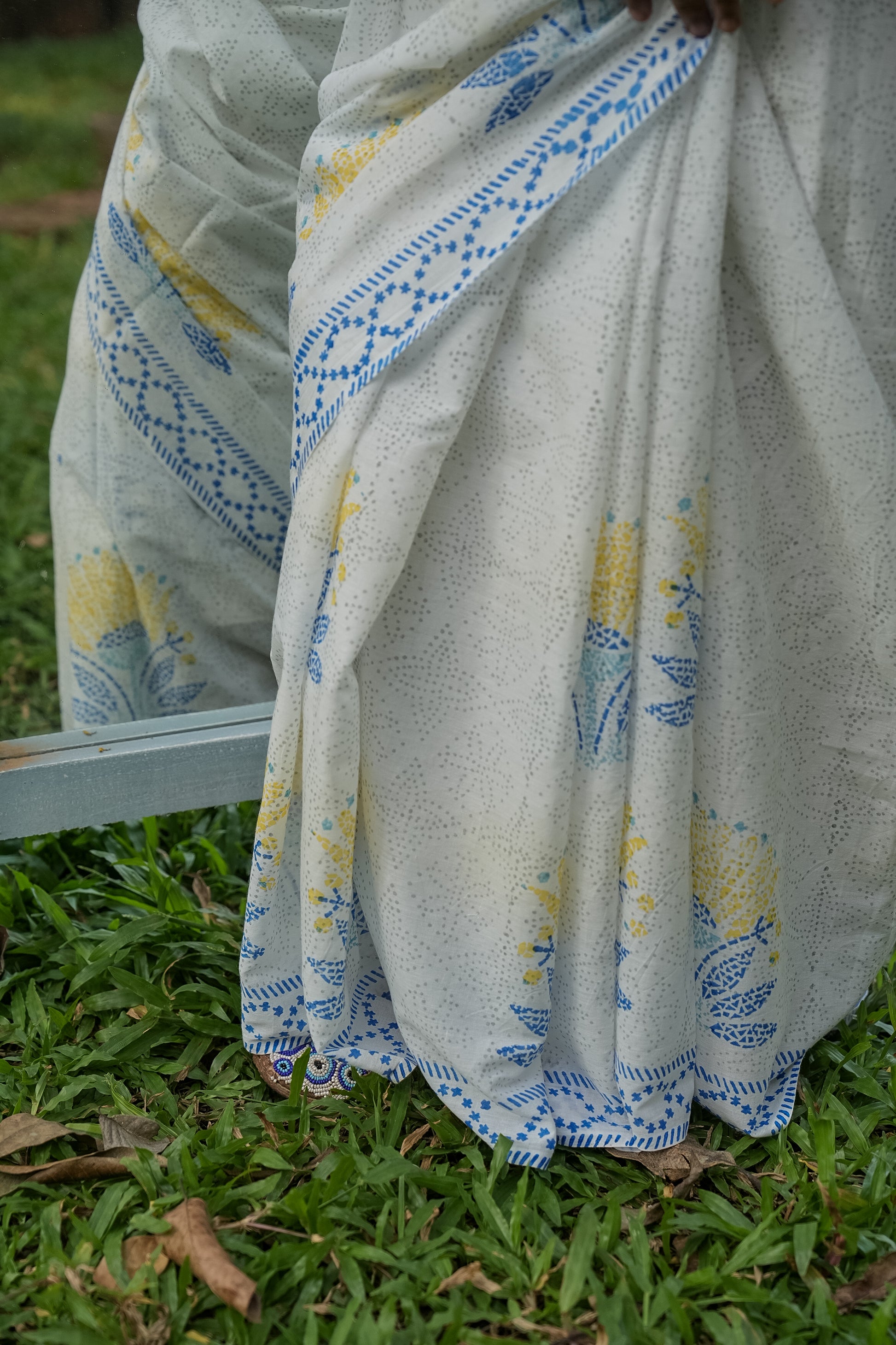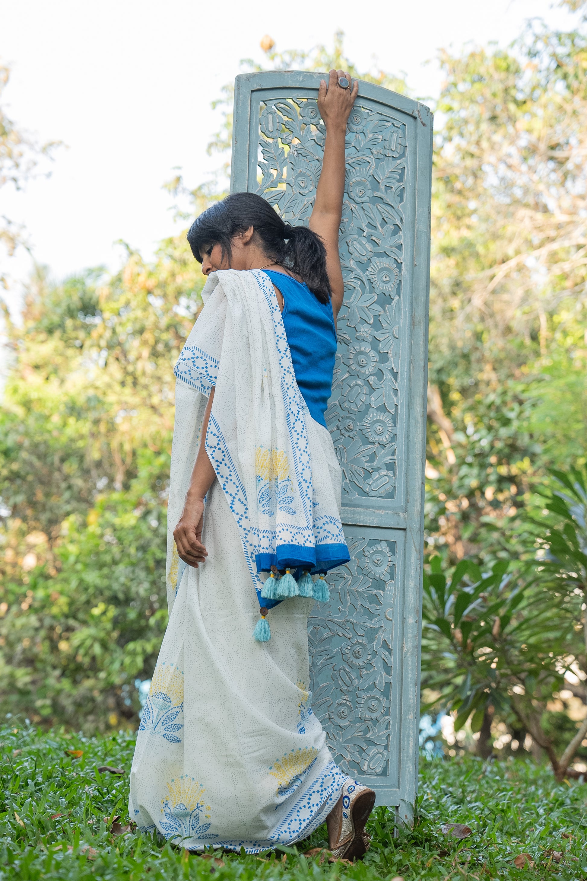 This minimal saree finds its inspiration in the creative method employed by Goans to decorate their floors. Years ago, discarded China, porcelain, and jars, which once acted as mere ballast in arriving ships at Goa’s ports, became treasures as they were repurposed by Goans. These fragments were meticulously gathered, fashioned into intricate shapes, and used to adorn the floors in stunning mosaic patterns. A tradition that sparks the floral print on our saree.