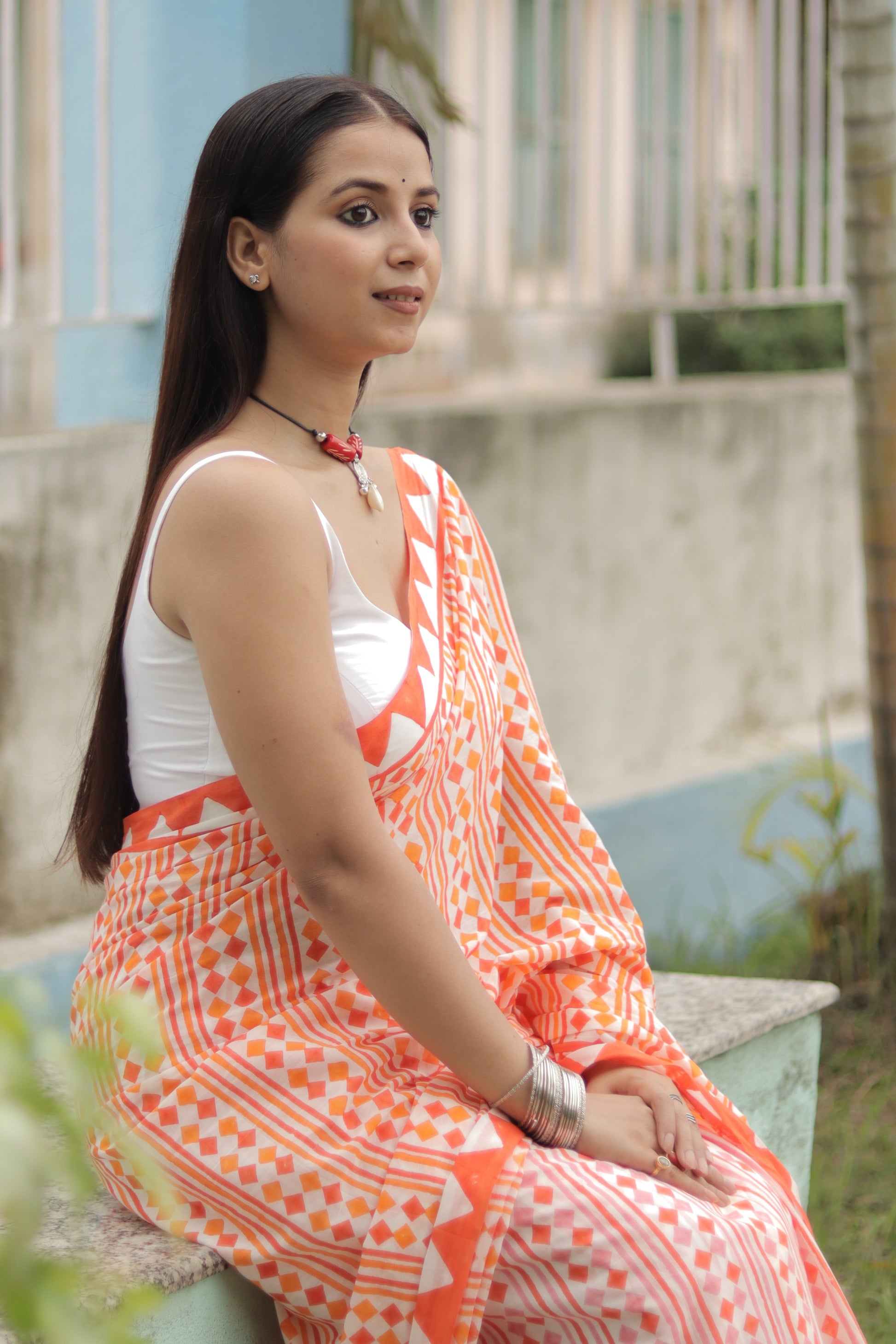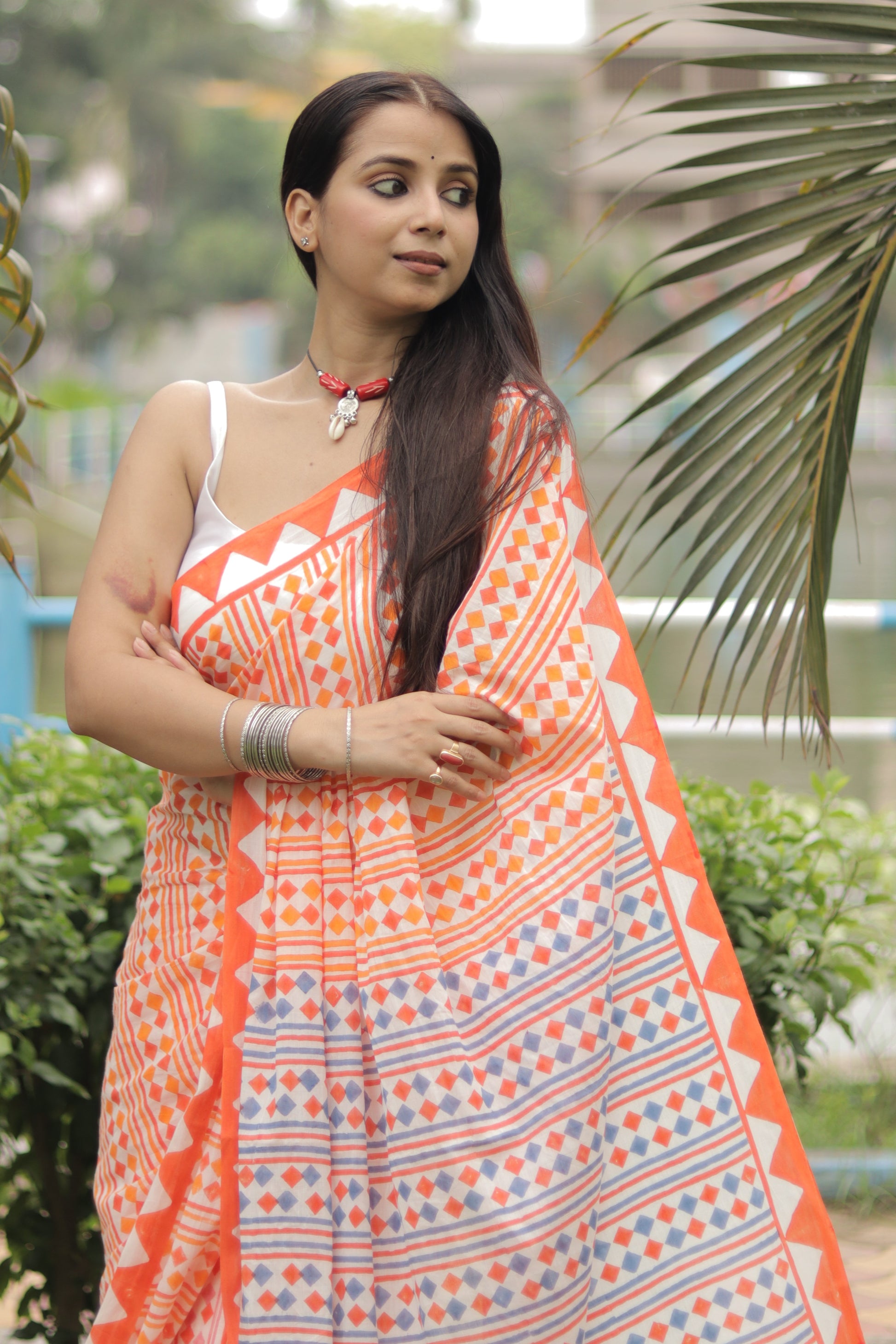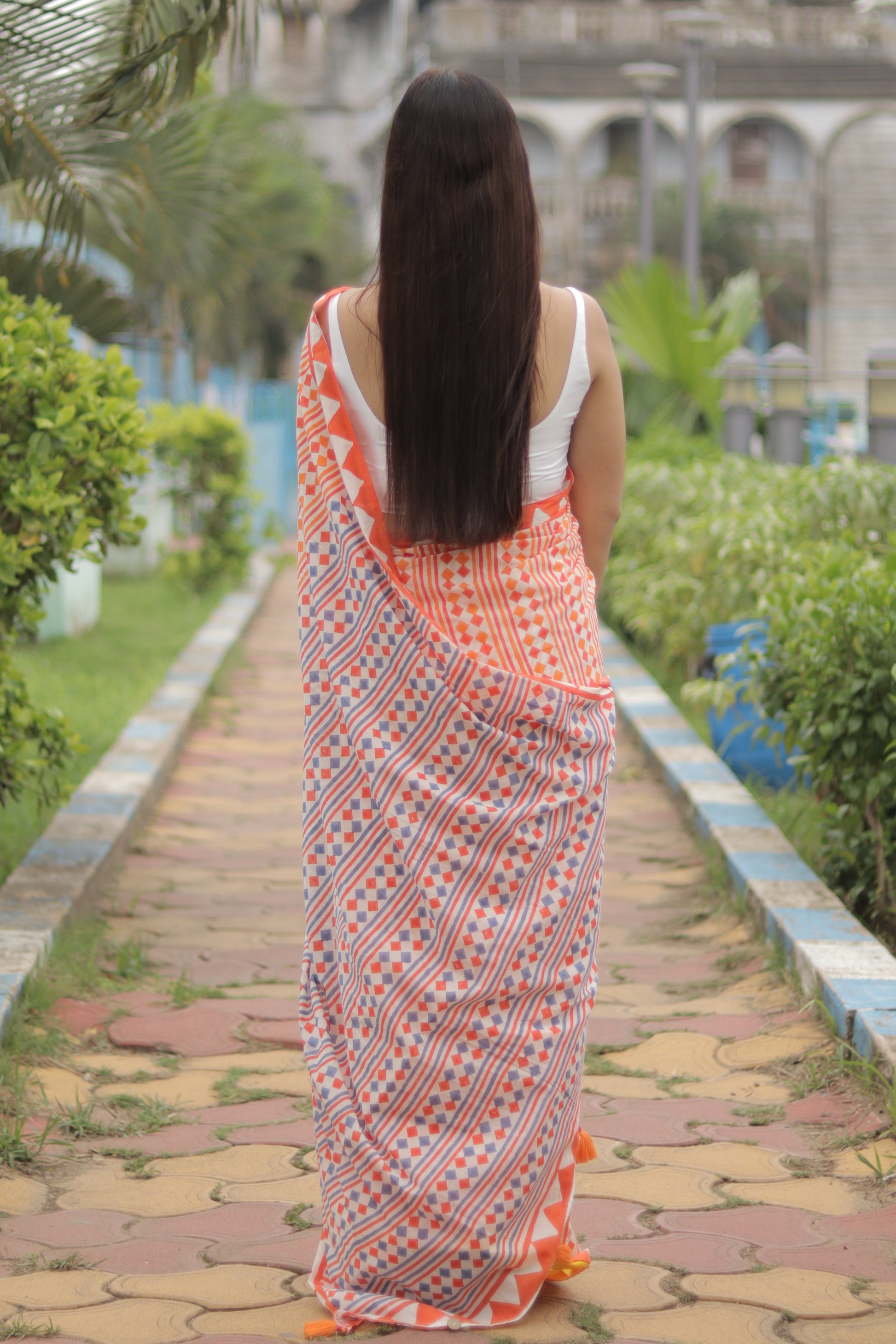 Discover the enchantment of this exquisite saree, featuring subtle color variations throughout that add a touch of sophistication to every drape. The motif, inspired by the traditional Kaavi art of Goa, brings a rich cultural heritage to your wardrobe. Crafted from the softest mul cotton, this saree is perfect for your everyday look, offering both elegance and comfort. Make a statement with this unique piece and let your style shine! This saree comes in the softest mul cotton fabric and is adorned with cute contrasting tassels. The saree comes with a blouse piece as shown in the last picture.
