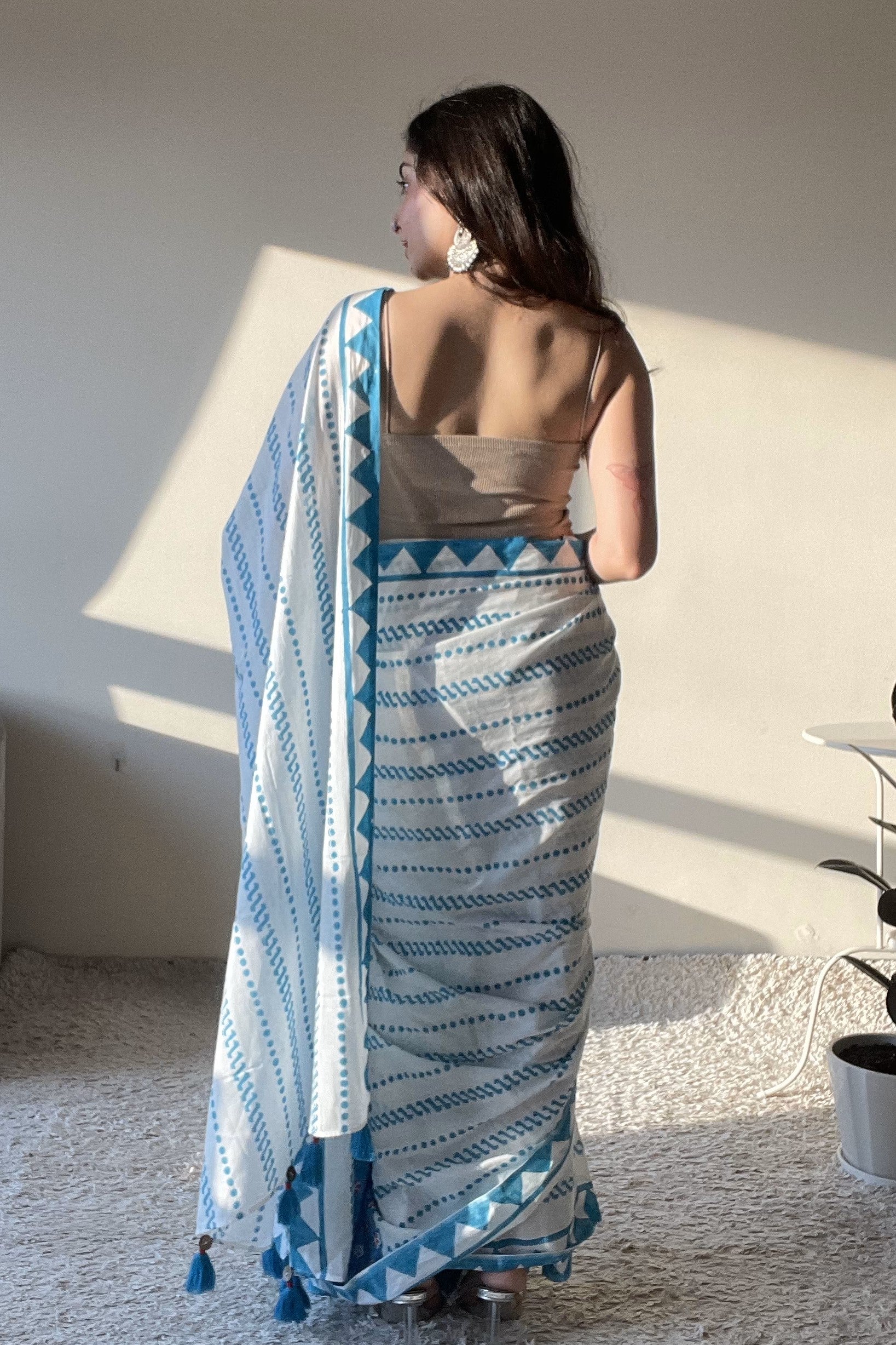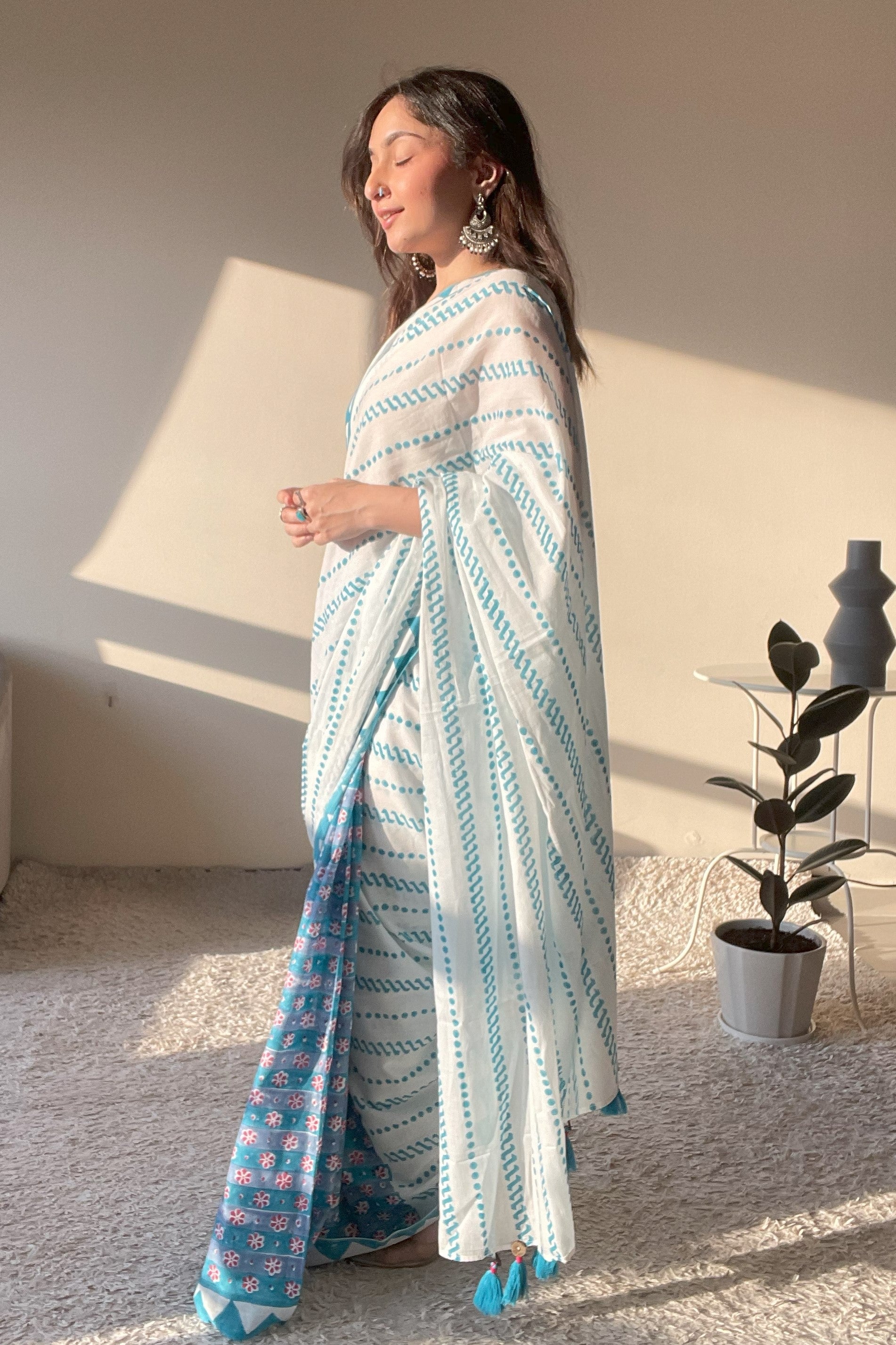 If you like everything unique, you should get your hands on our most unique design yet! This saree features a floral contrast at the waist pleats, while the rest of the saree is inspired by the geometric borders of Kaavi temple art. The blue contrast adds a soothing touch to the entire design. Not a fan of blue? We've got the same saree in orange and blue as well. Check it out here! This saree comes in the softest mul cotton fabric and is adorned with cute contrasting tassels. The saree comes with a blouse piece as shown in the last picture.