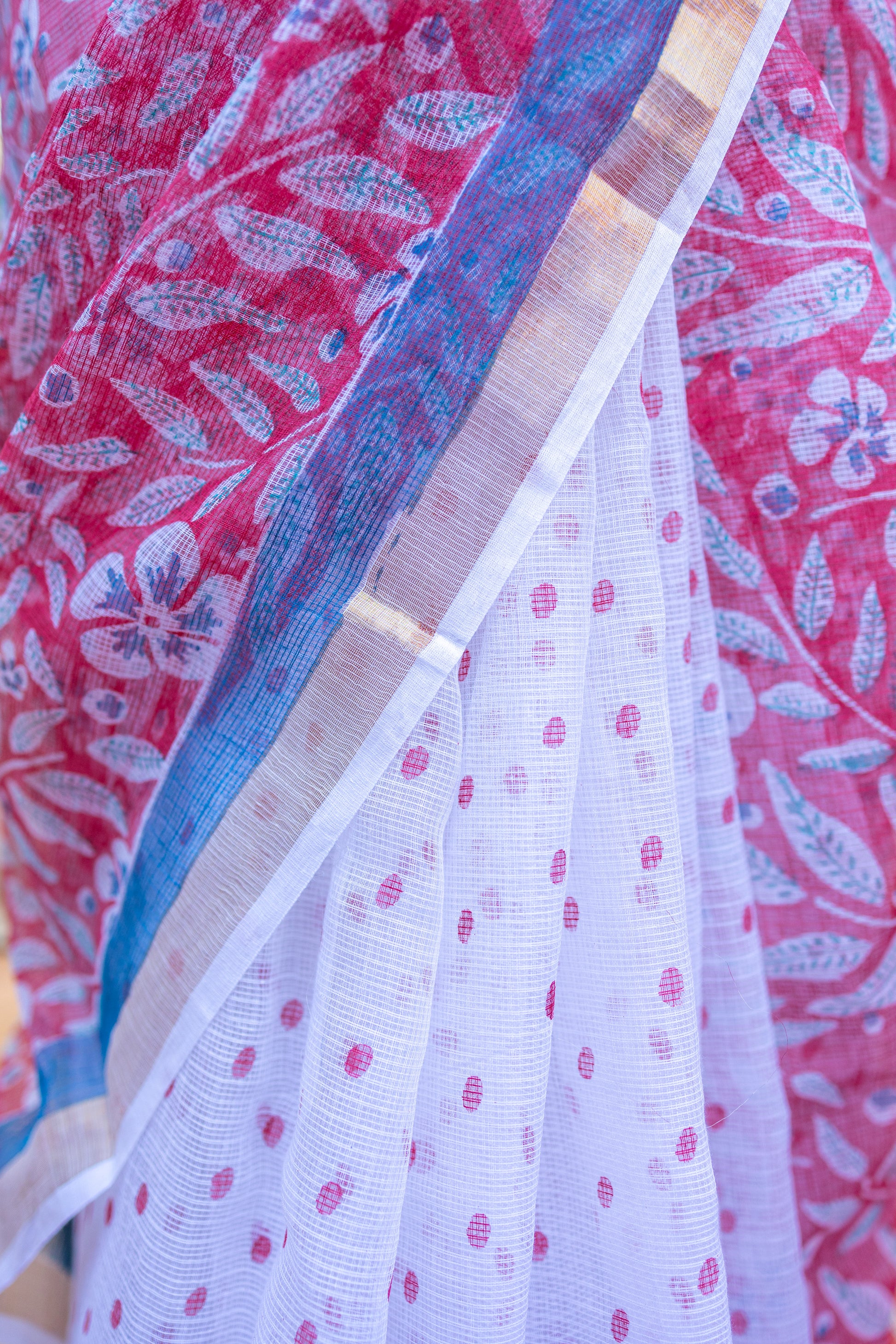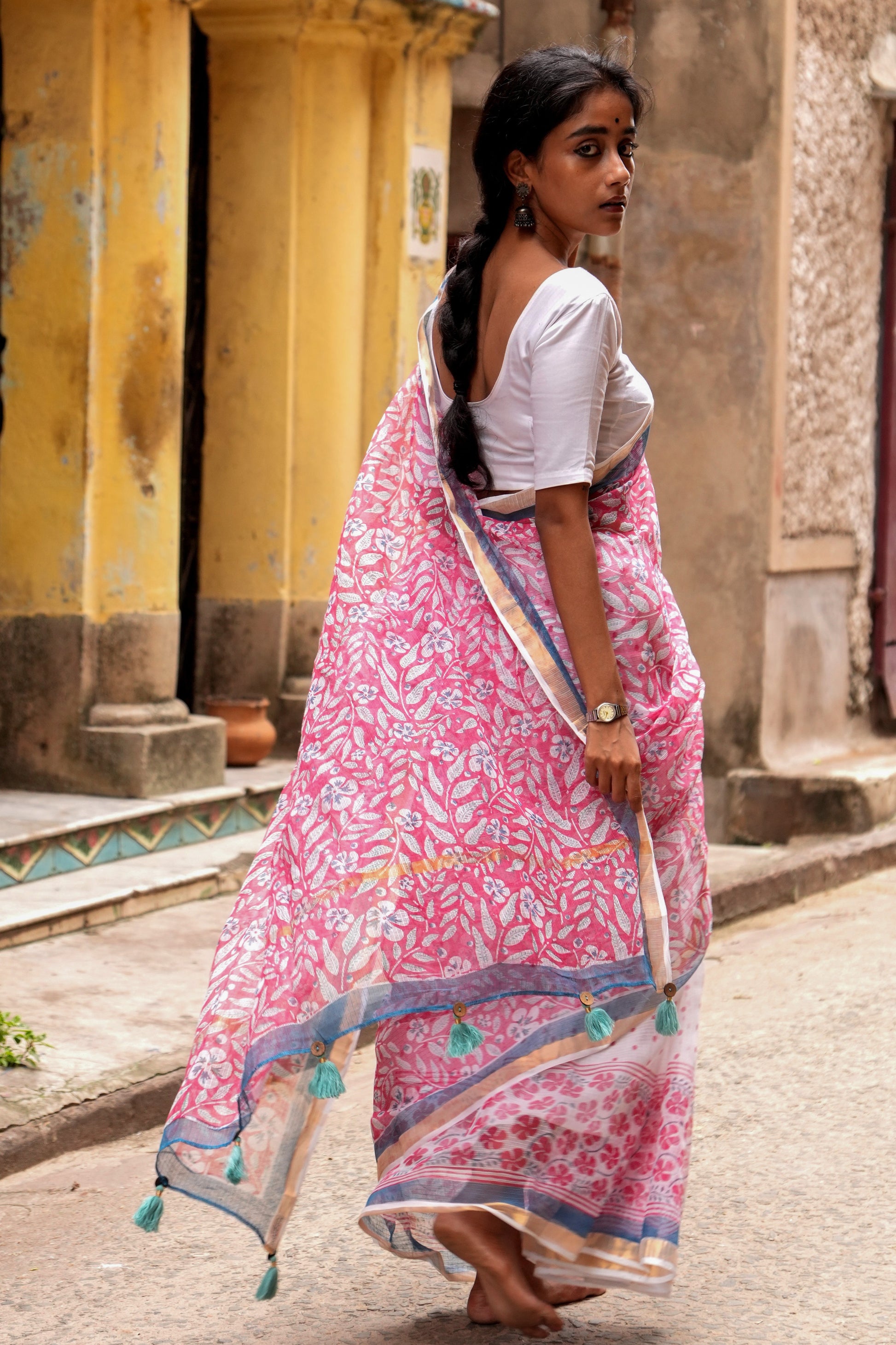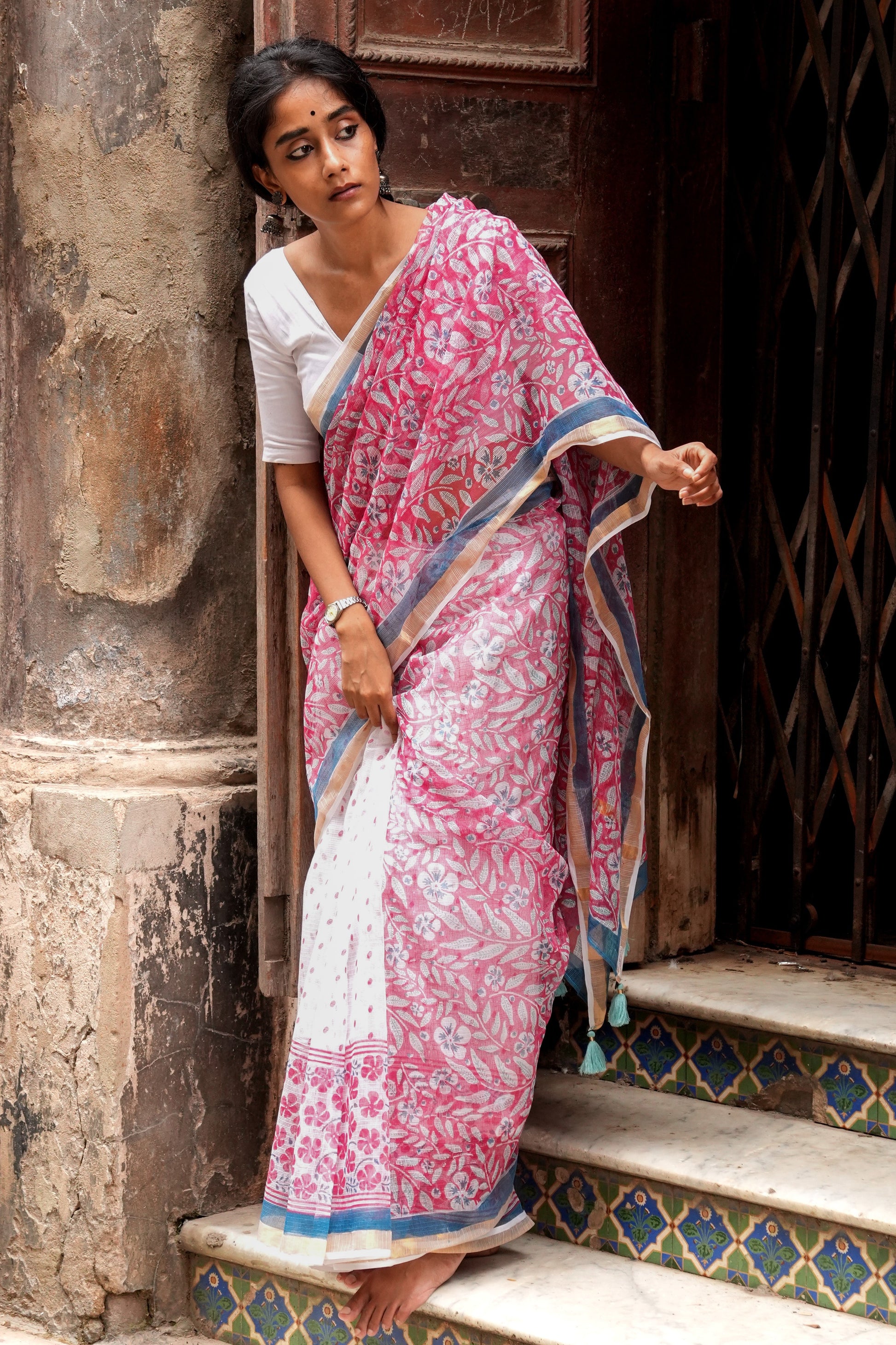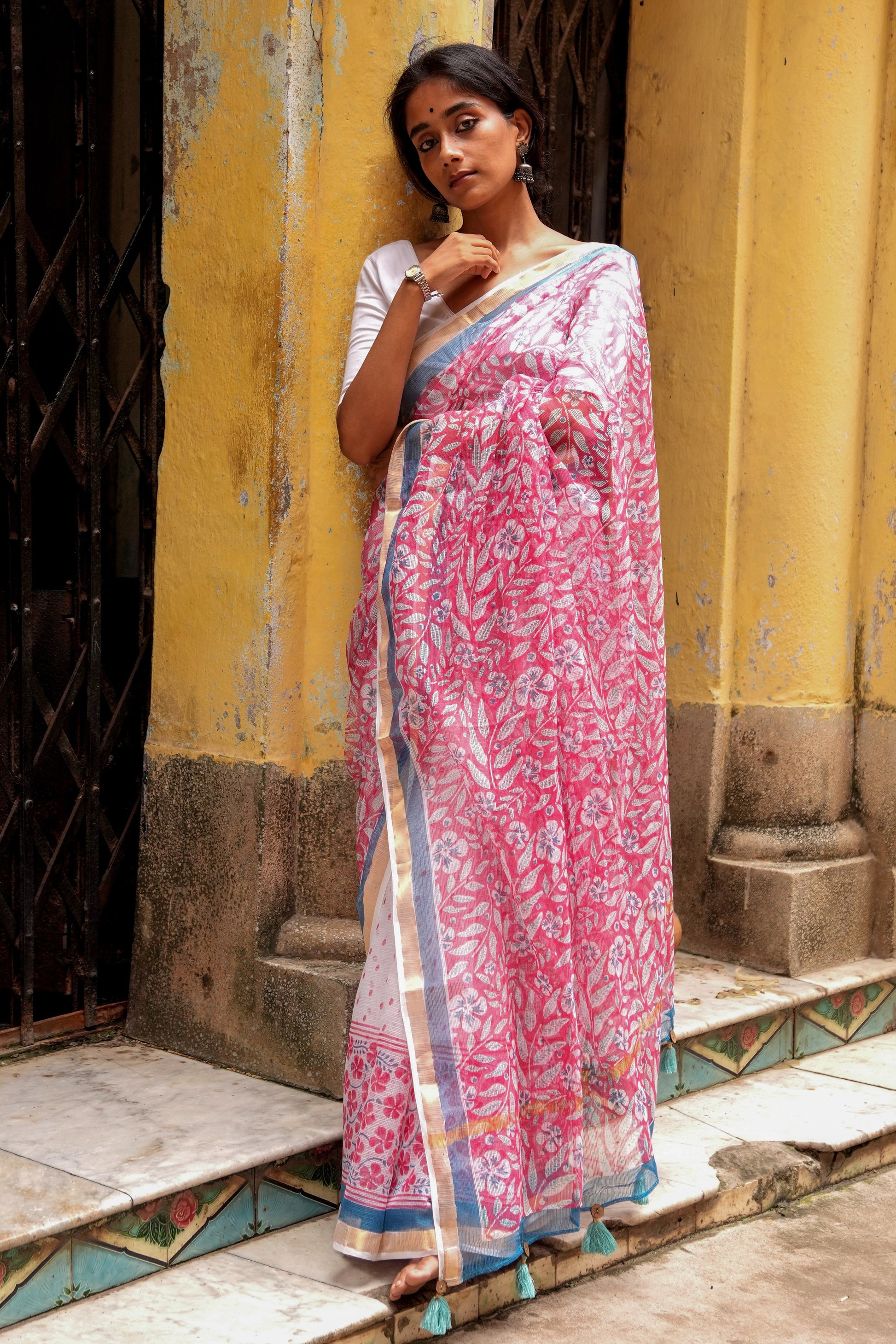 Sadafuli flower has a unique asymmetric shape and is found in every Goan backyard. The flower is usually white or pink. We couldn’t decide which one was prettier so decided to present you both in this half-and-half saree. Sadafuli saree also comes with golden zari on pallu and borders. The unique and light weight Kota Doria saree is surely your next muse!