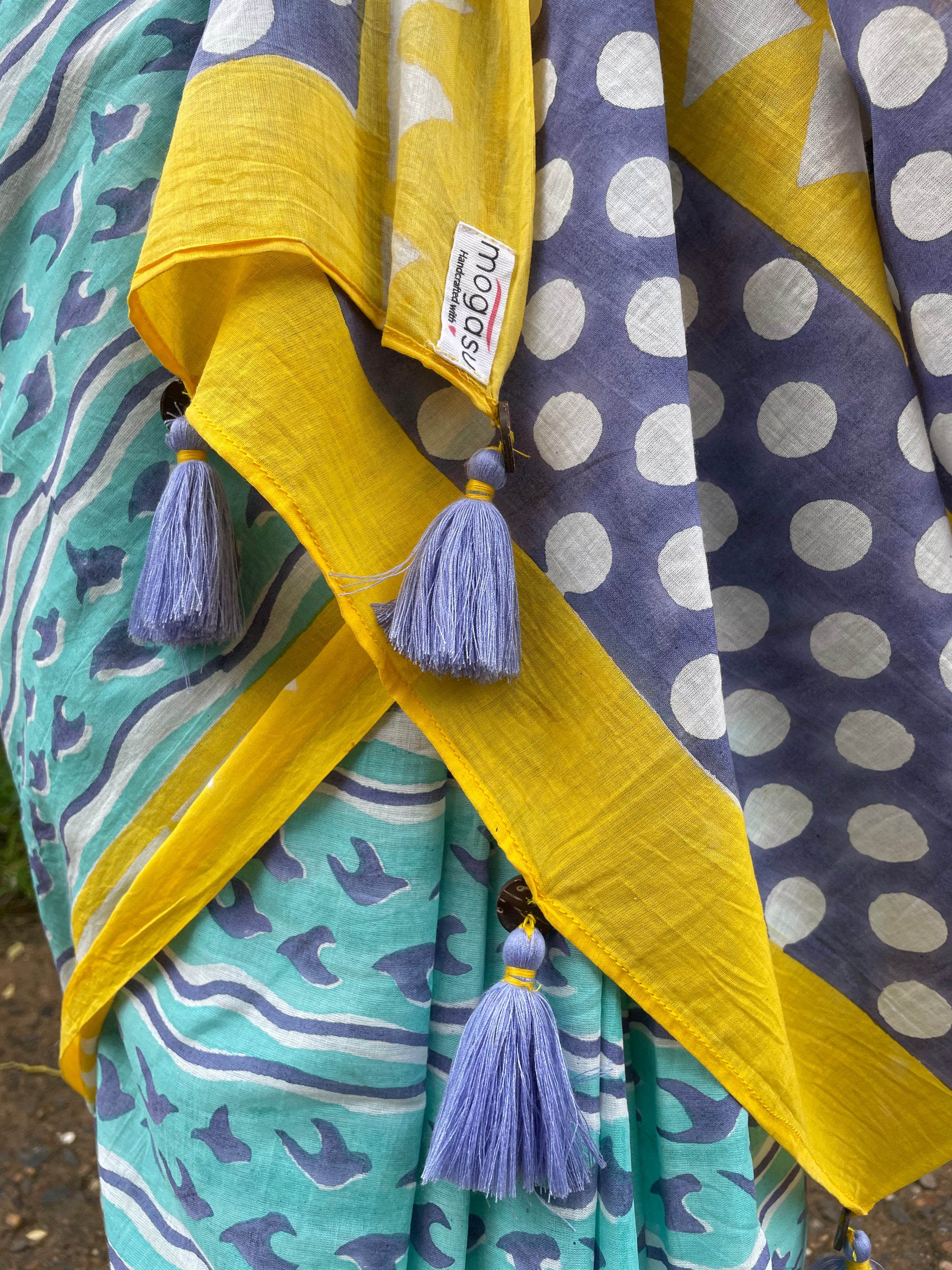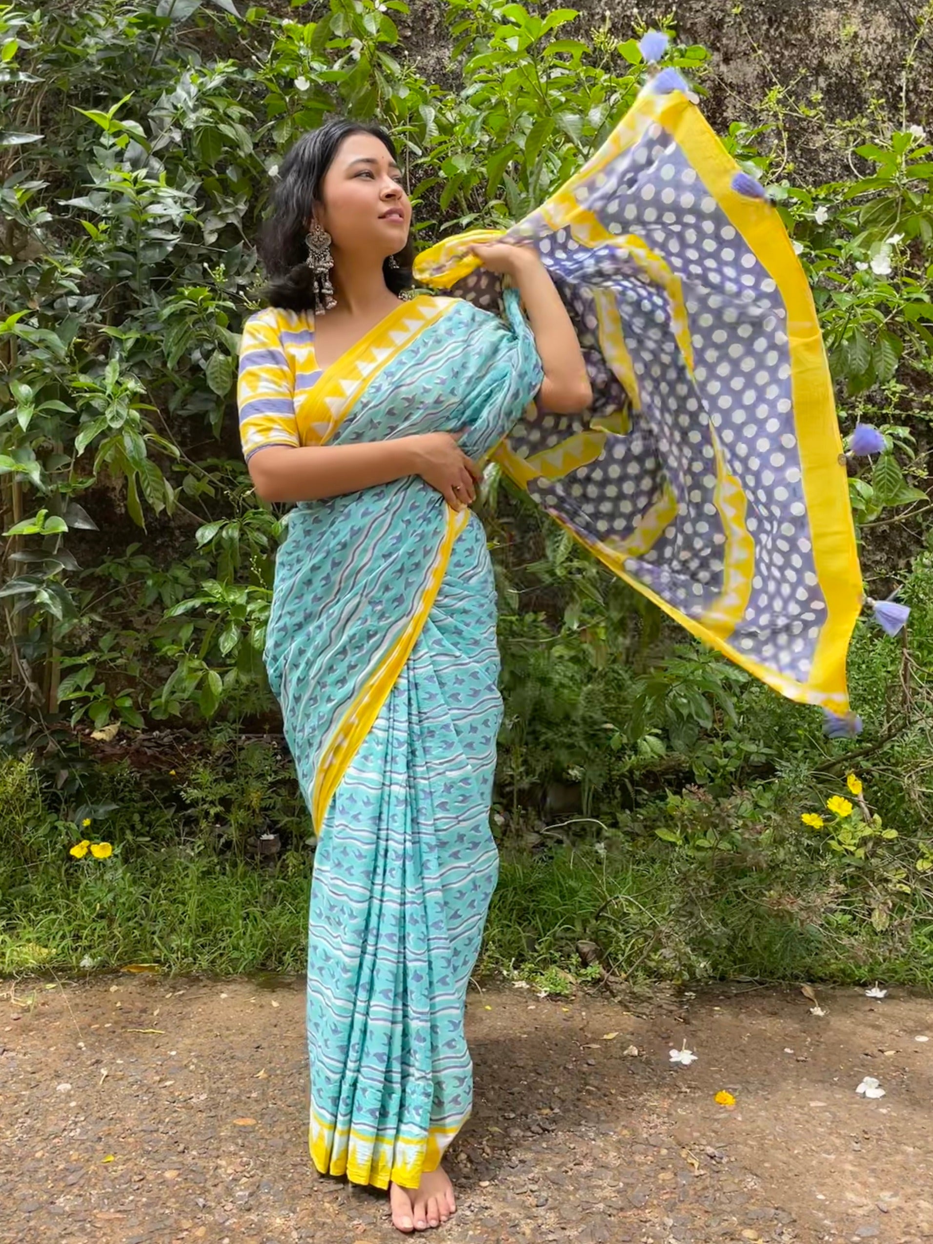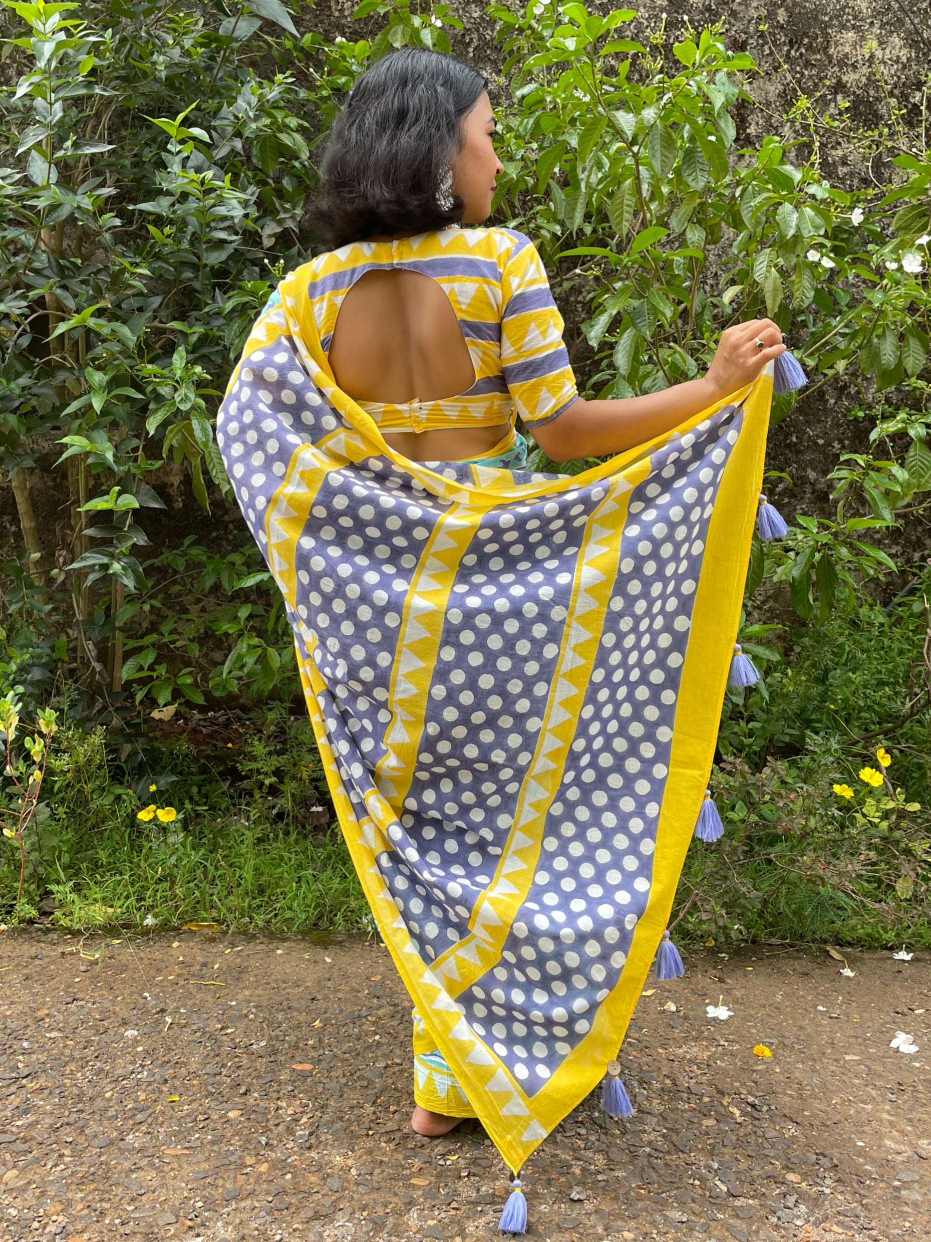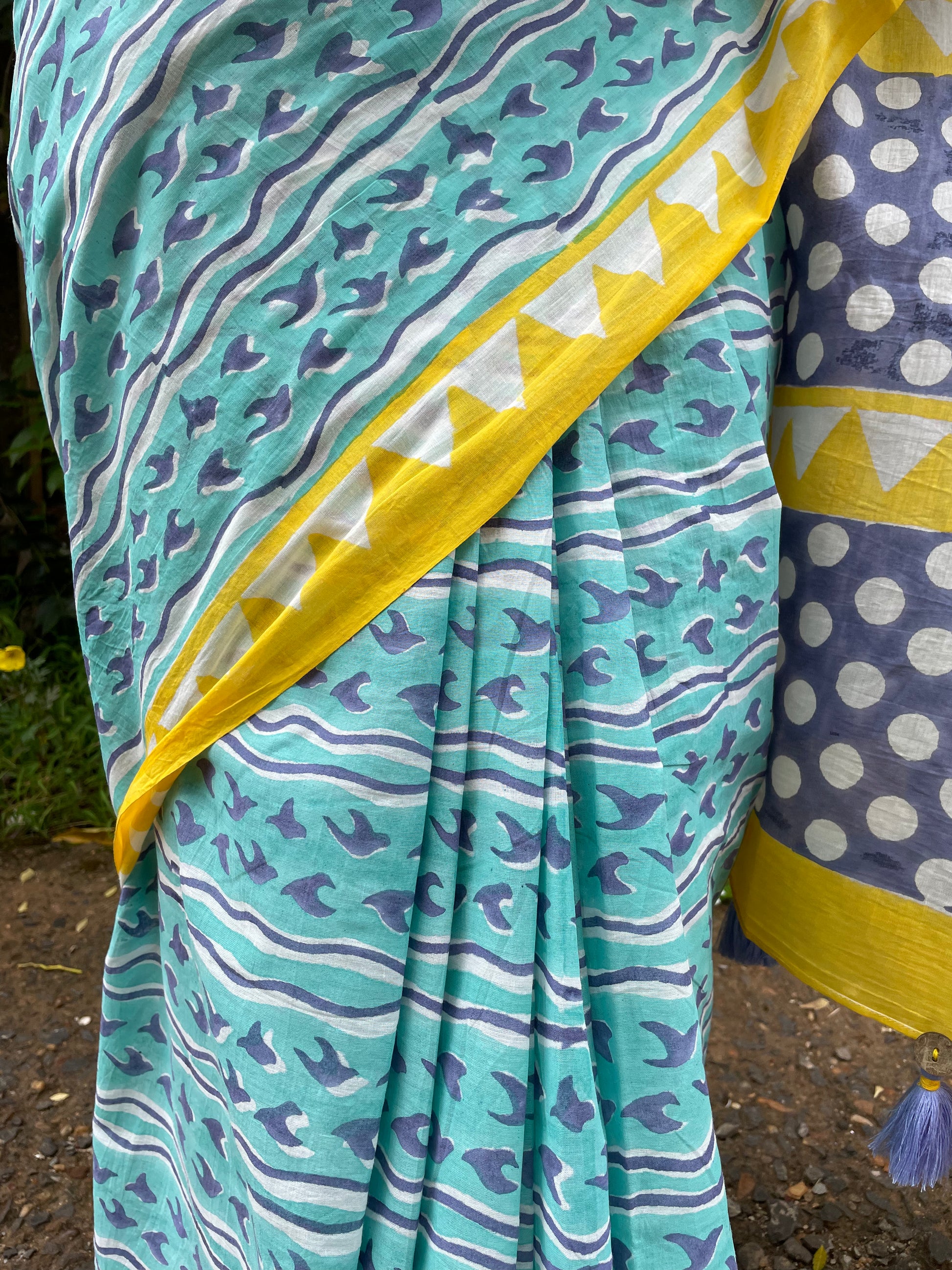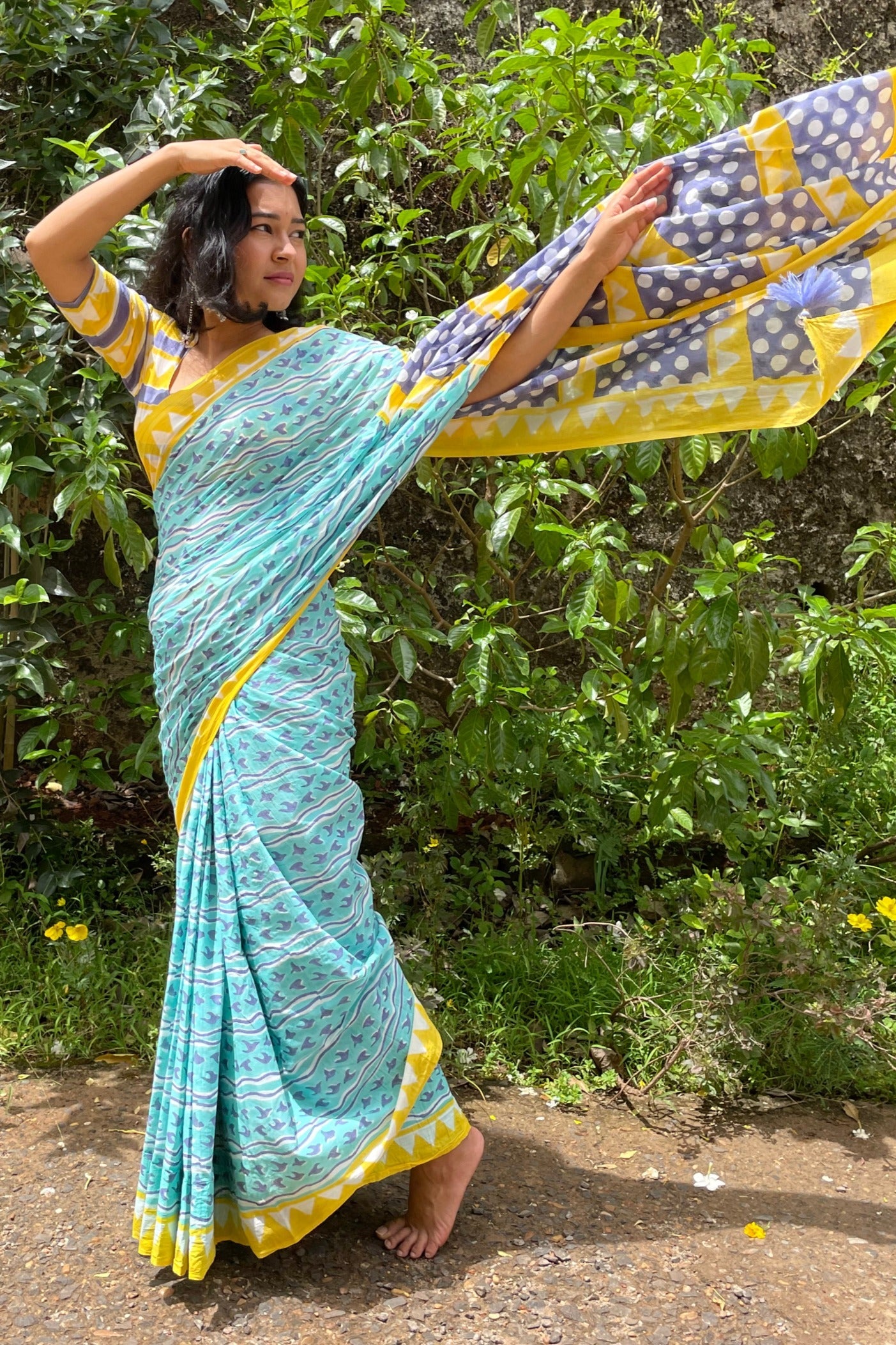 Sunbirds are tiny, shiny and fast. In fact, when the sun rays hits the bird, it appears shiny and purple. Our Sunbird saree is inspired by flocks of sunbirds flying against the yellow sun rays. This saree comes in the softest mul cotton fabric and keeps getting softer with every wash!