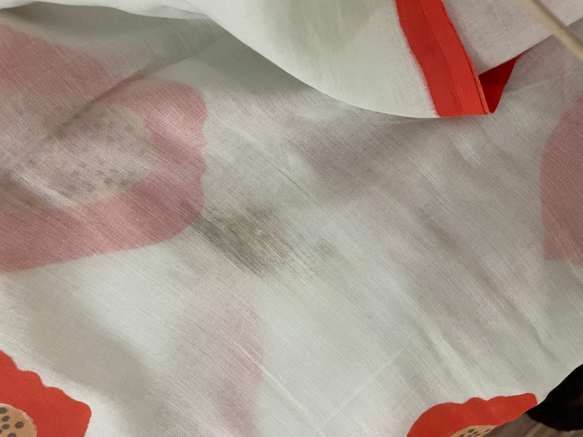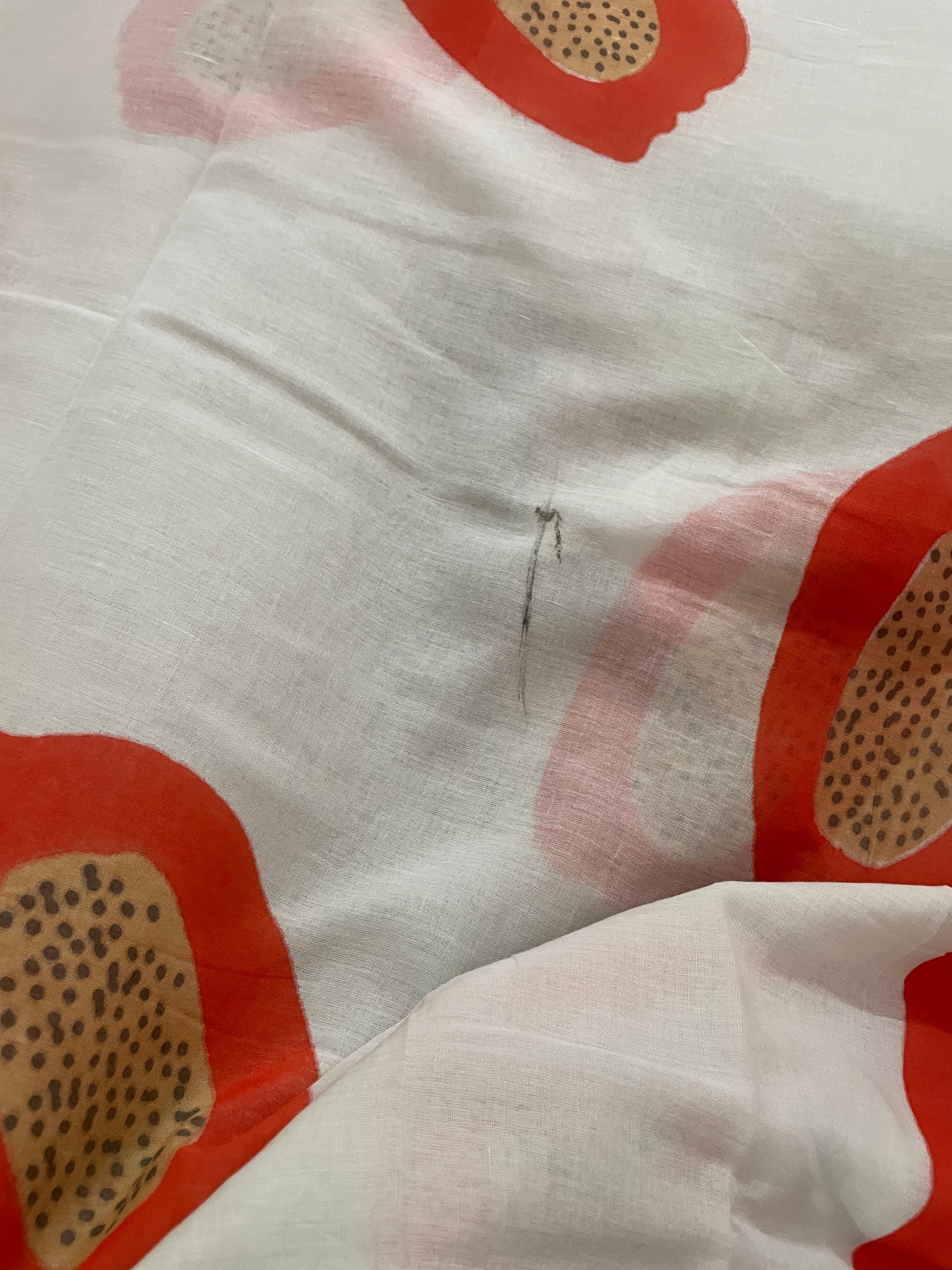 Black stain as shown in the second picture in the middle of the saree. Black stain line and selvedge damage near pallu as shown in the pictures.